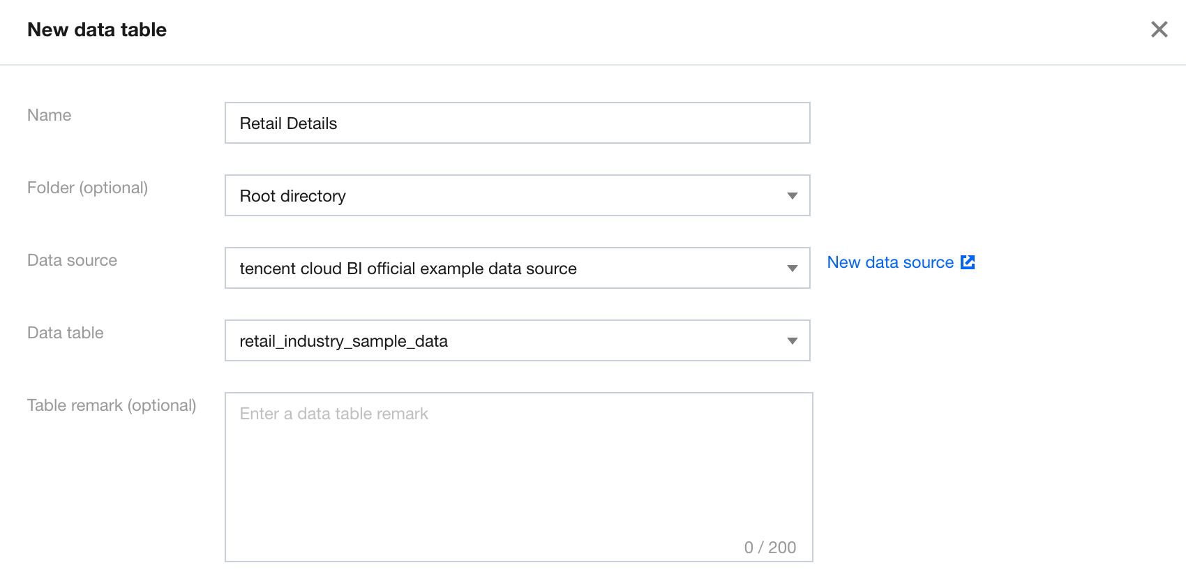 Select data source: Click the drop-down icon to select a connected data source. Click "Create data source" to open the data source list page in a new window, and a pop-up window for creating a data source will appear. After creation, click the drop-down list again to load the created data source.