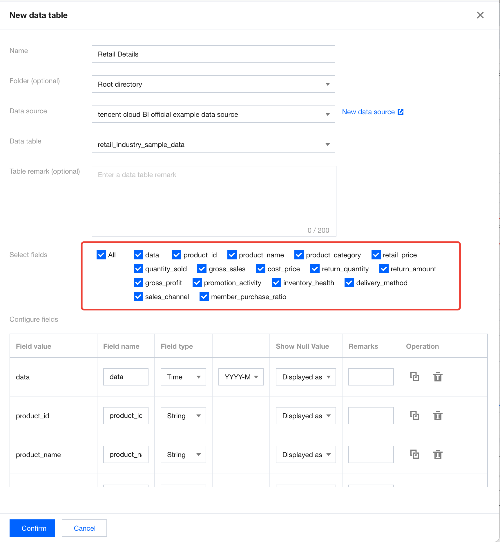 1. After a data table is selected, all fields of the table will be loaded. You can select the fields, and the selected fields will be the fields of the data table. Selecting all fields is supported. 2. The meanings of field configuration items are as follows.