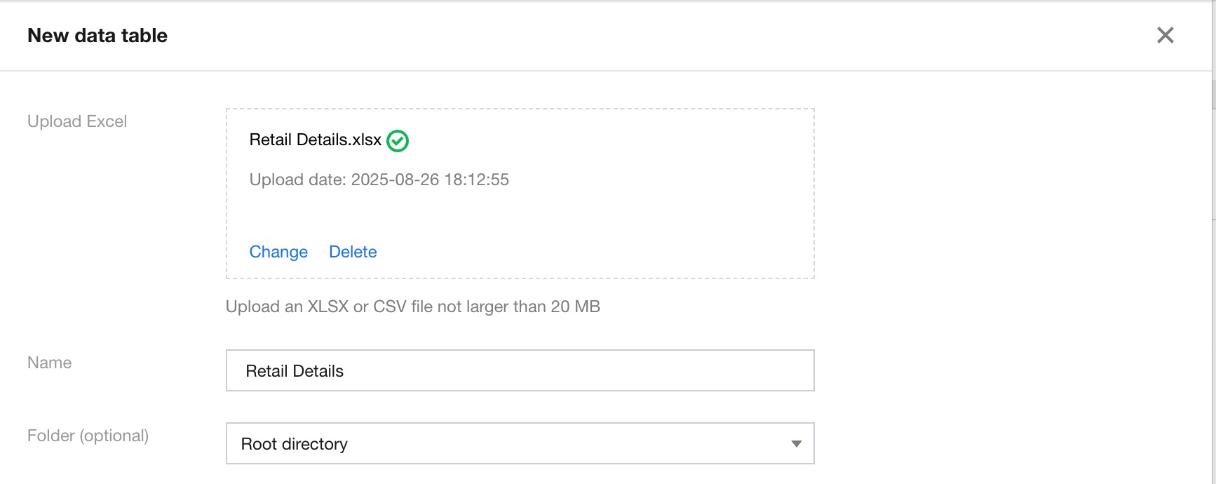 In the Data Table module under Data, click Create Data Table, select Excel Upload, and complete the following configurations: Upload Excel: Files in XLSX and CSV formats can be uploaded, with a maximum size of 20 MB.