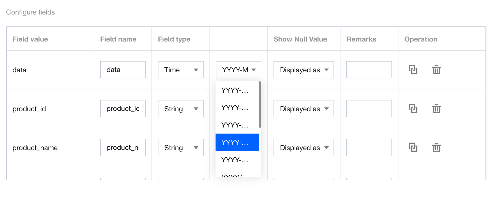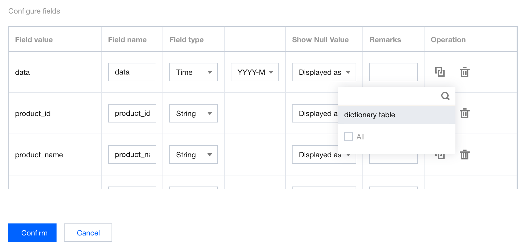 Field type: Available options are "time", "character", "numeric value", and "associated dictionary". By default, the field format needs to be read. When "time" is selected, you can perform a second-level selection for different granularities of the time format.