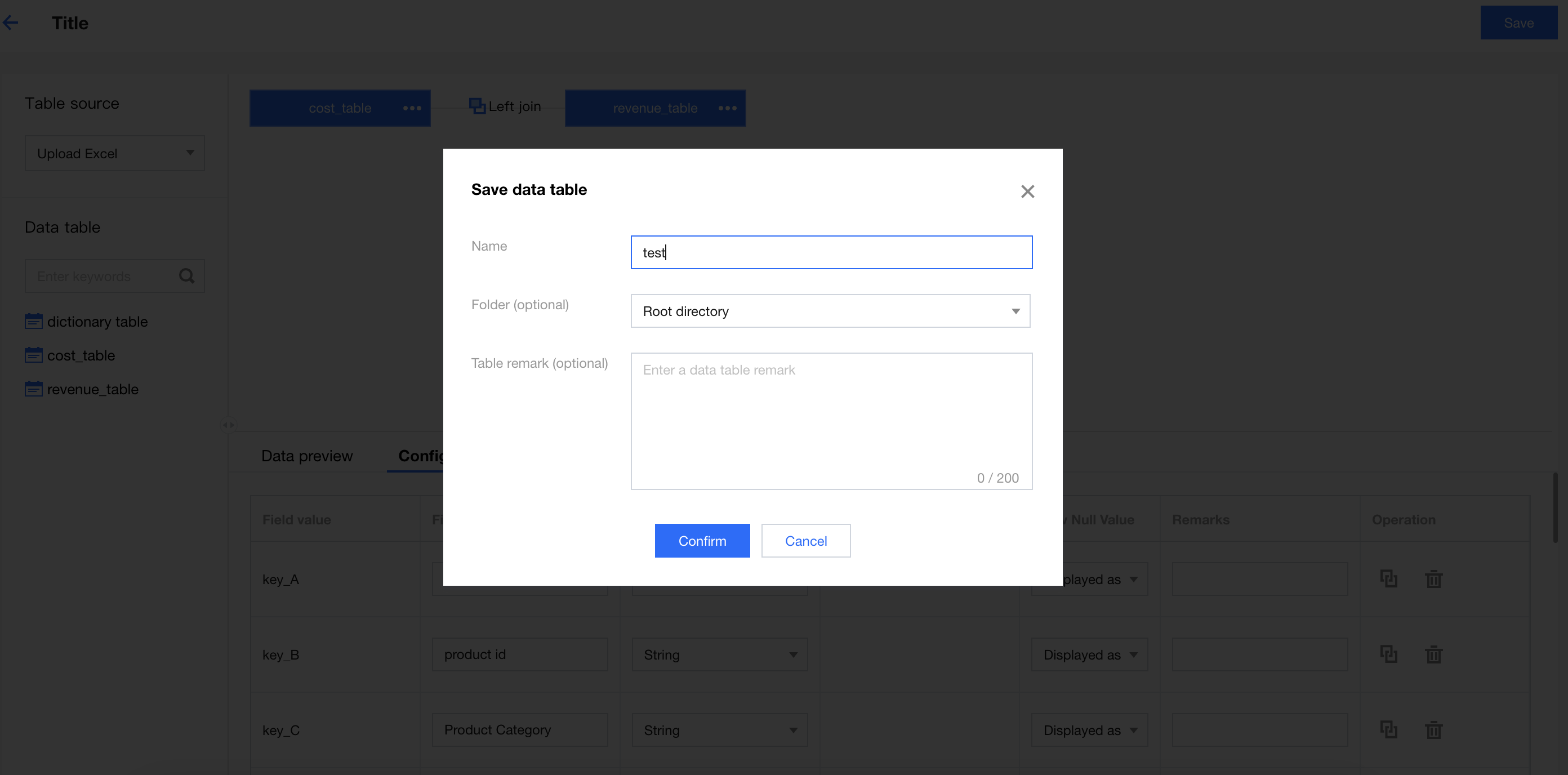 After the association, click Save at the top right of the page, then enter the display name and folder (optional) of the new data table to complete its creation.