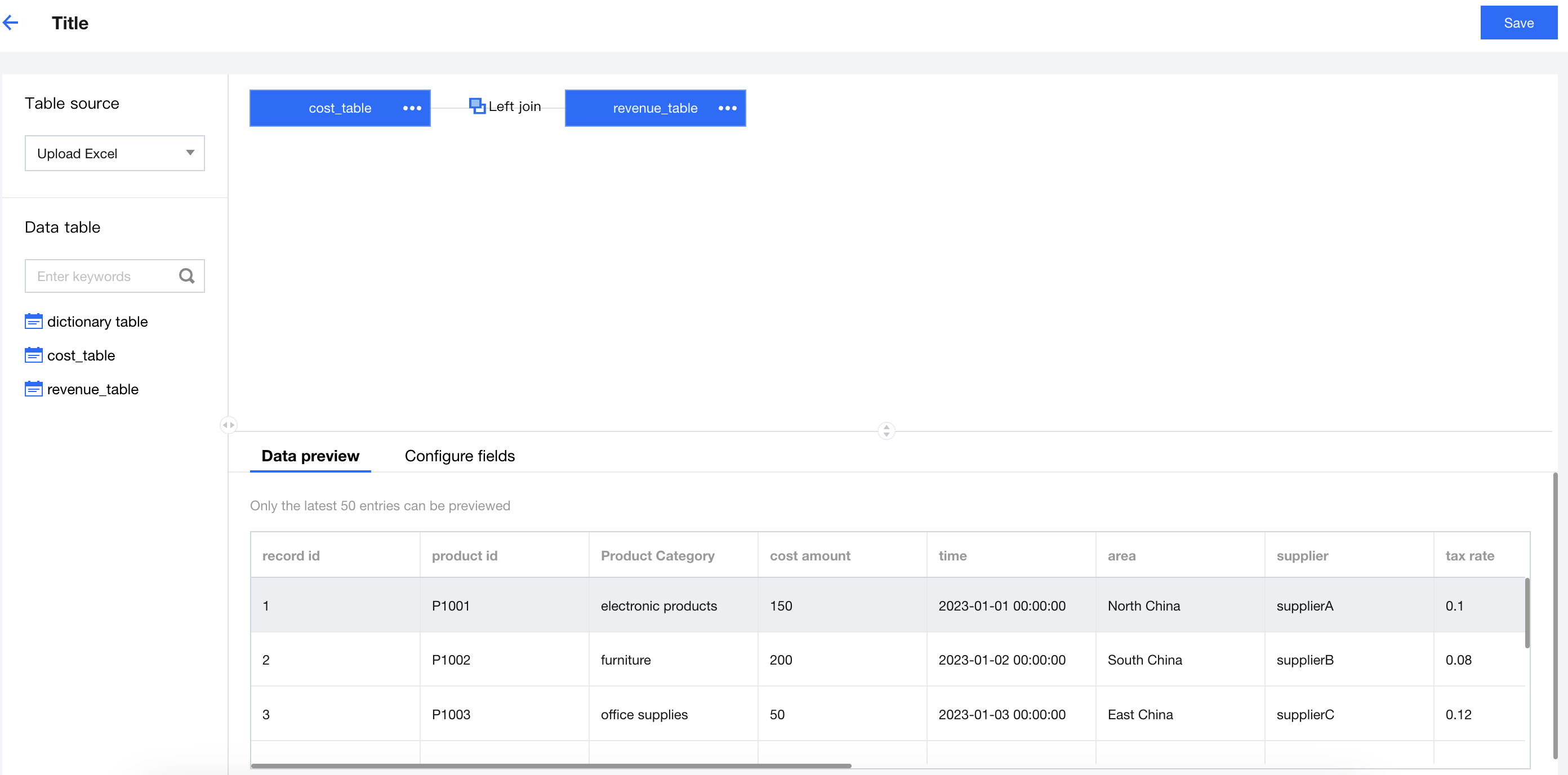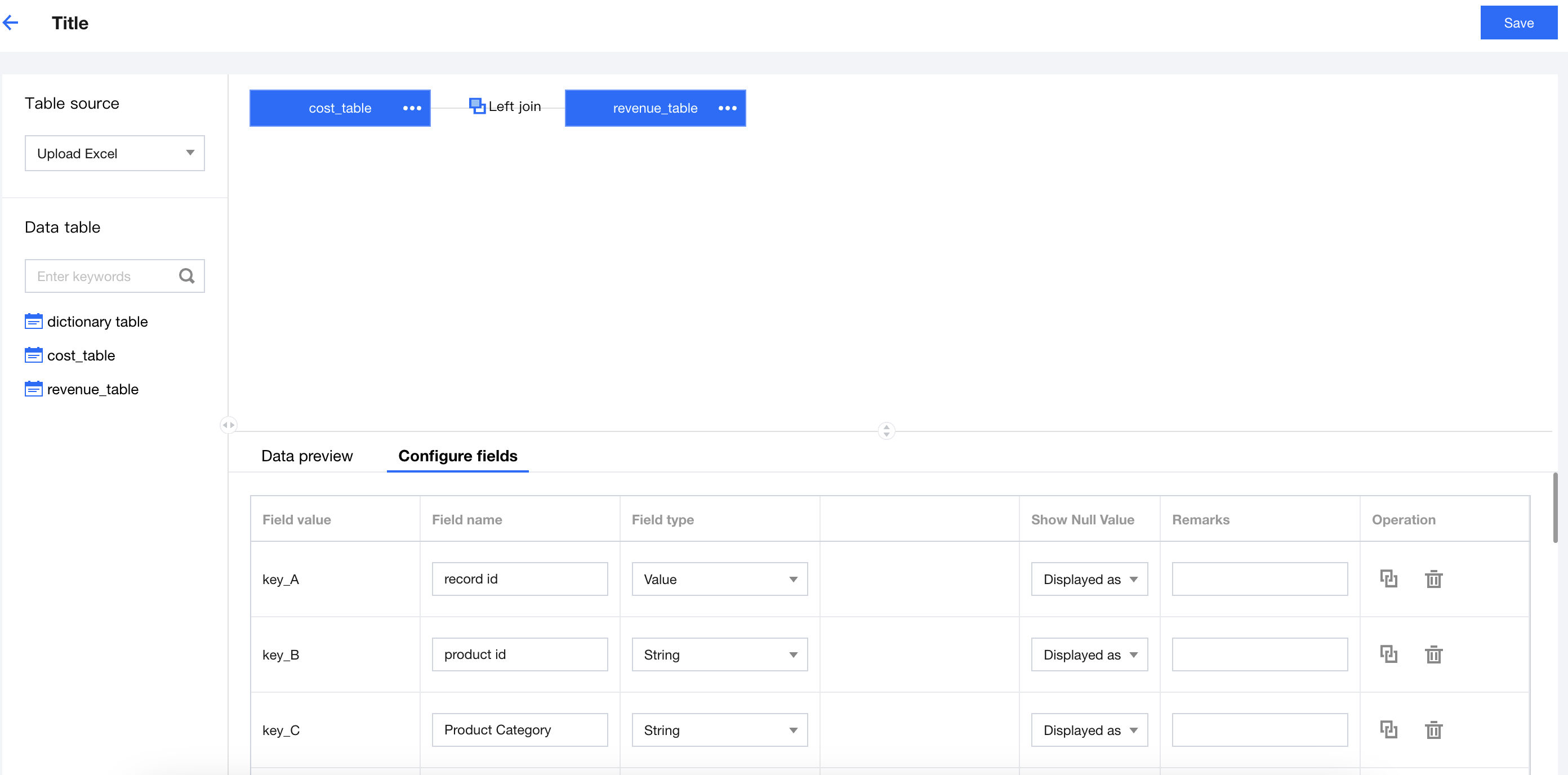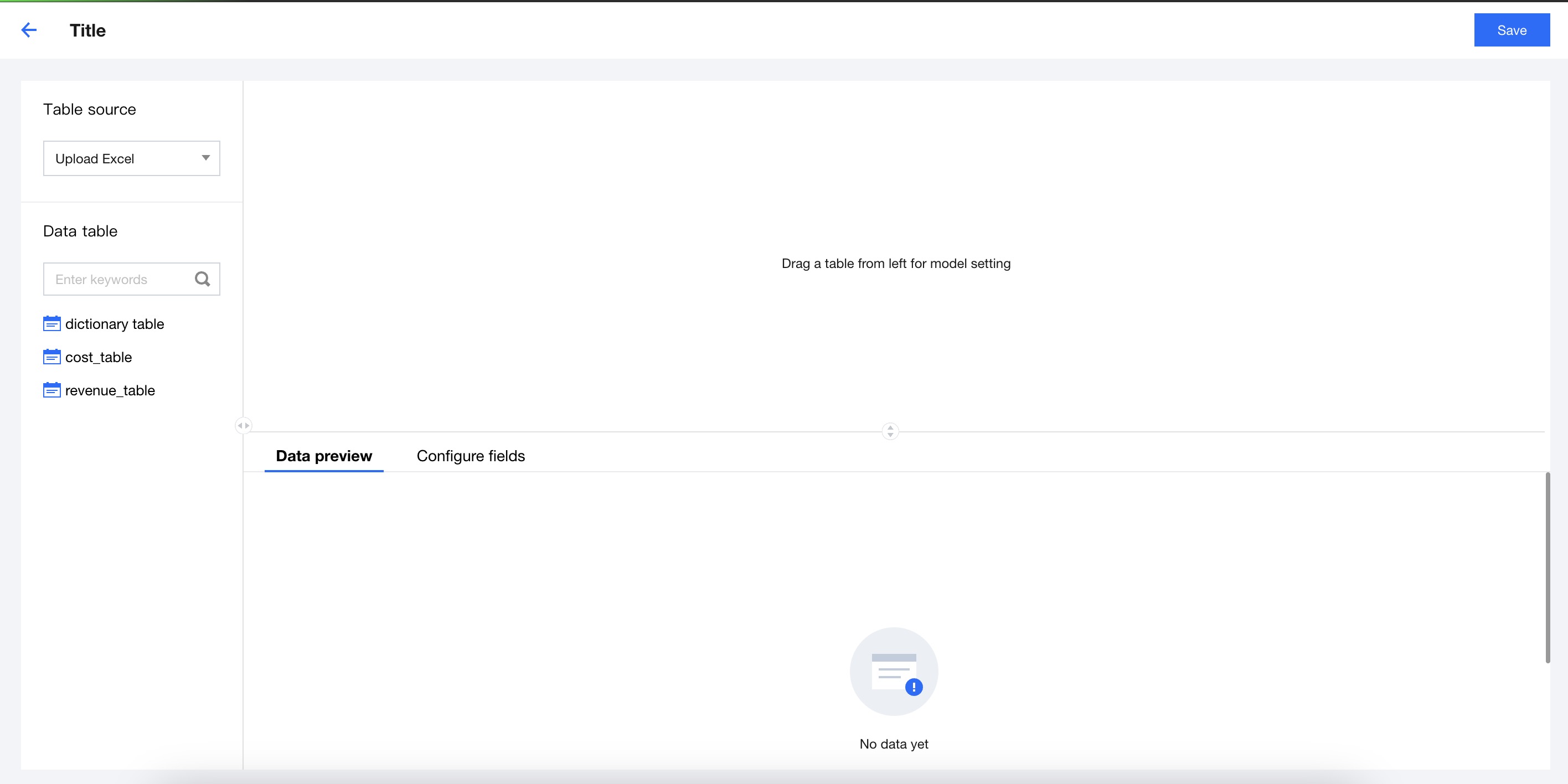 Go to the multi-table association page. The default state is as shown below. The left side is the data table selection area, the top right is the canvas area, and the lower right is the data preview and field configuration area.