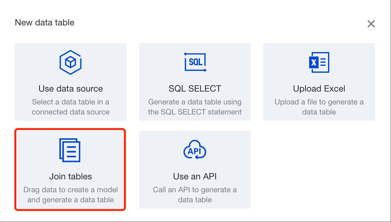 Multi-table association refers to connecting multiple tables through data associations to form a model for data analysis when the data to be analyzed is stored across different tables. Multi-table association typically supports the following association modes: