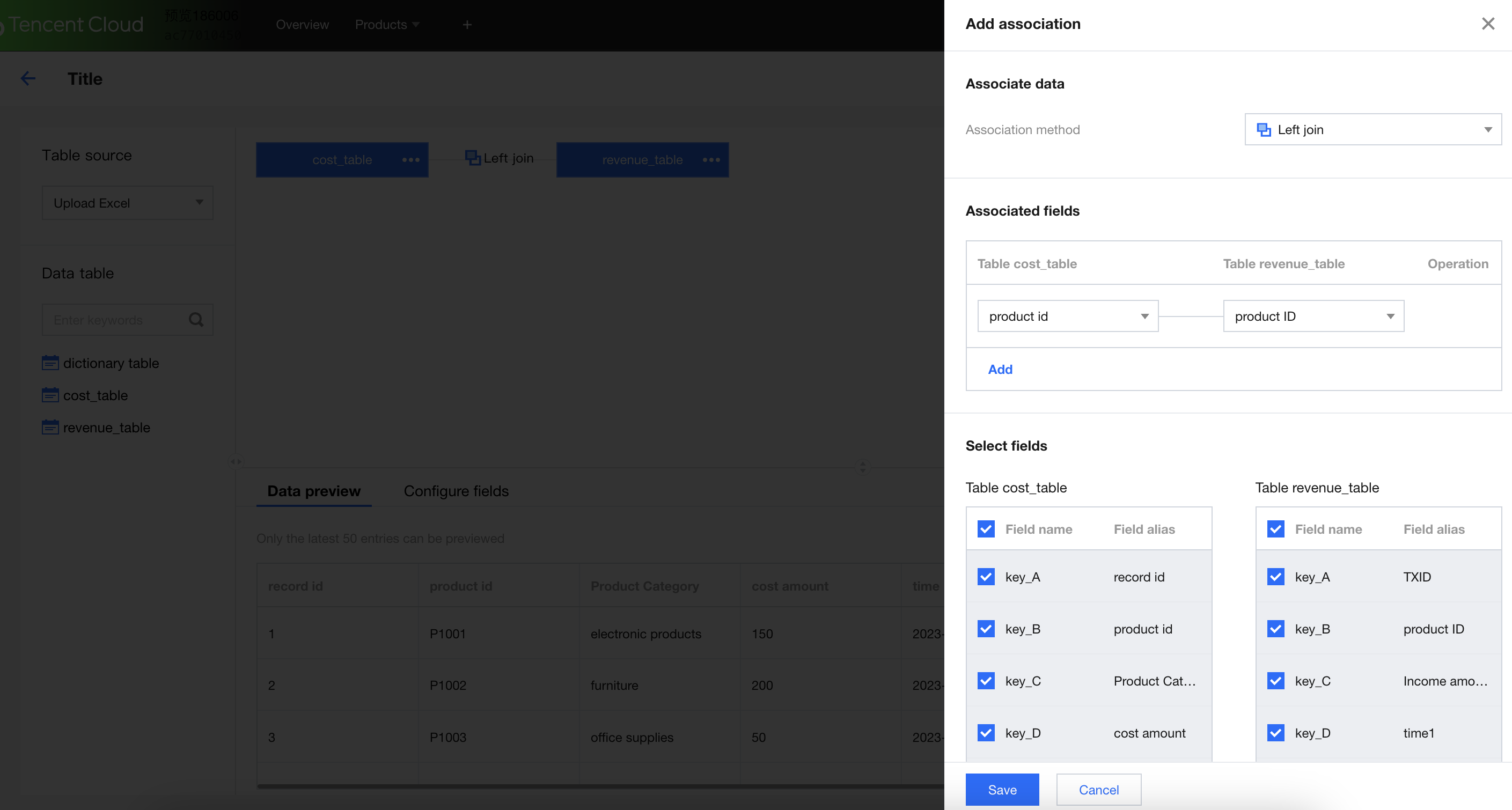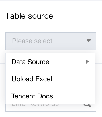 Step one: select the data table to be used for association. First, choose the source of the data table, divided into data source, Excel upload, and Tencent Documents.