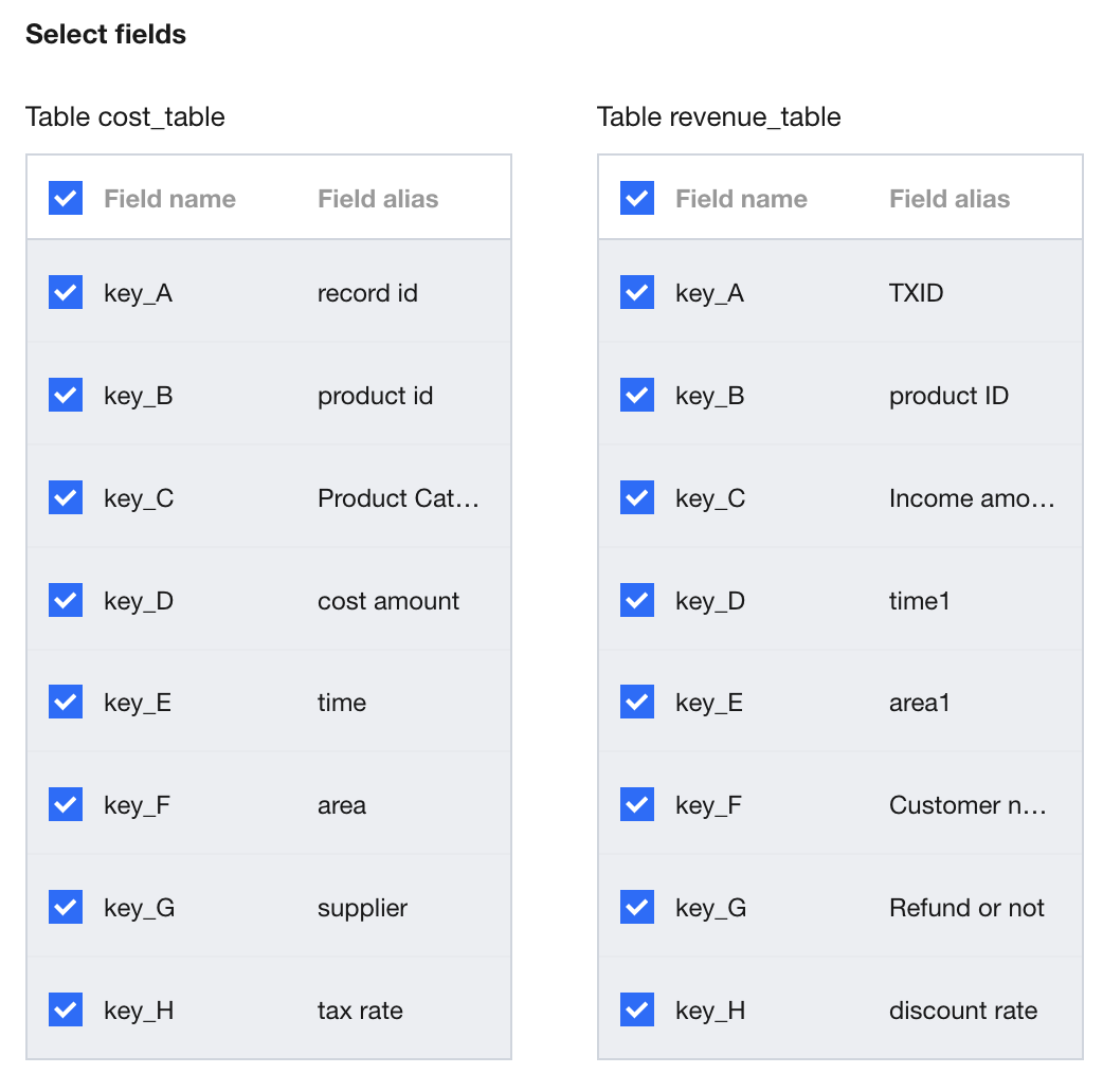 Finally, perform field selection. Field selection refers to choosing which fields to display in the associated data table. By default, all fields are selected. If not required, you can uncheck certain fields to hide them.