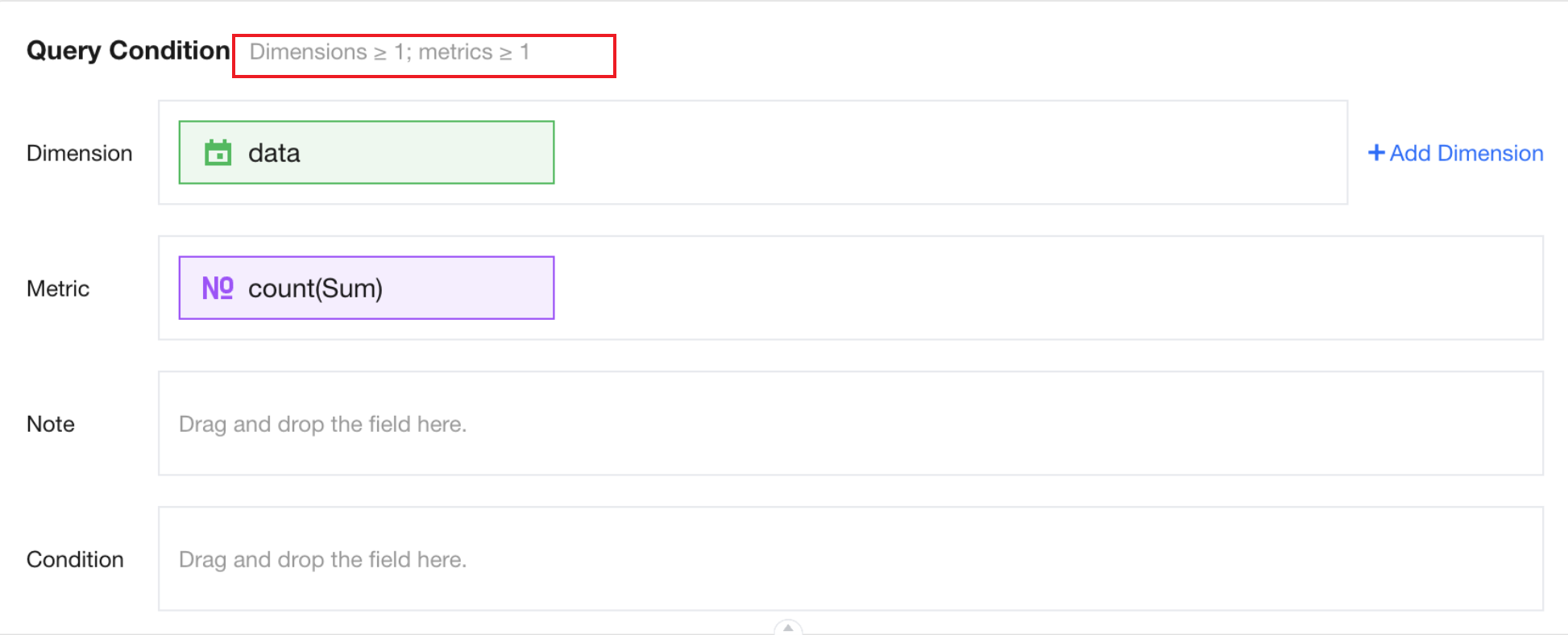 The number of dimension and metric configurations supported by the chart component is displayed in the query condition box. If the dimension and metric fields are not set according to the configuration requirements, the system will report an error.