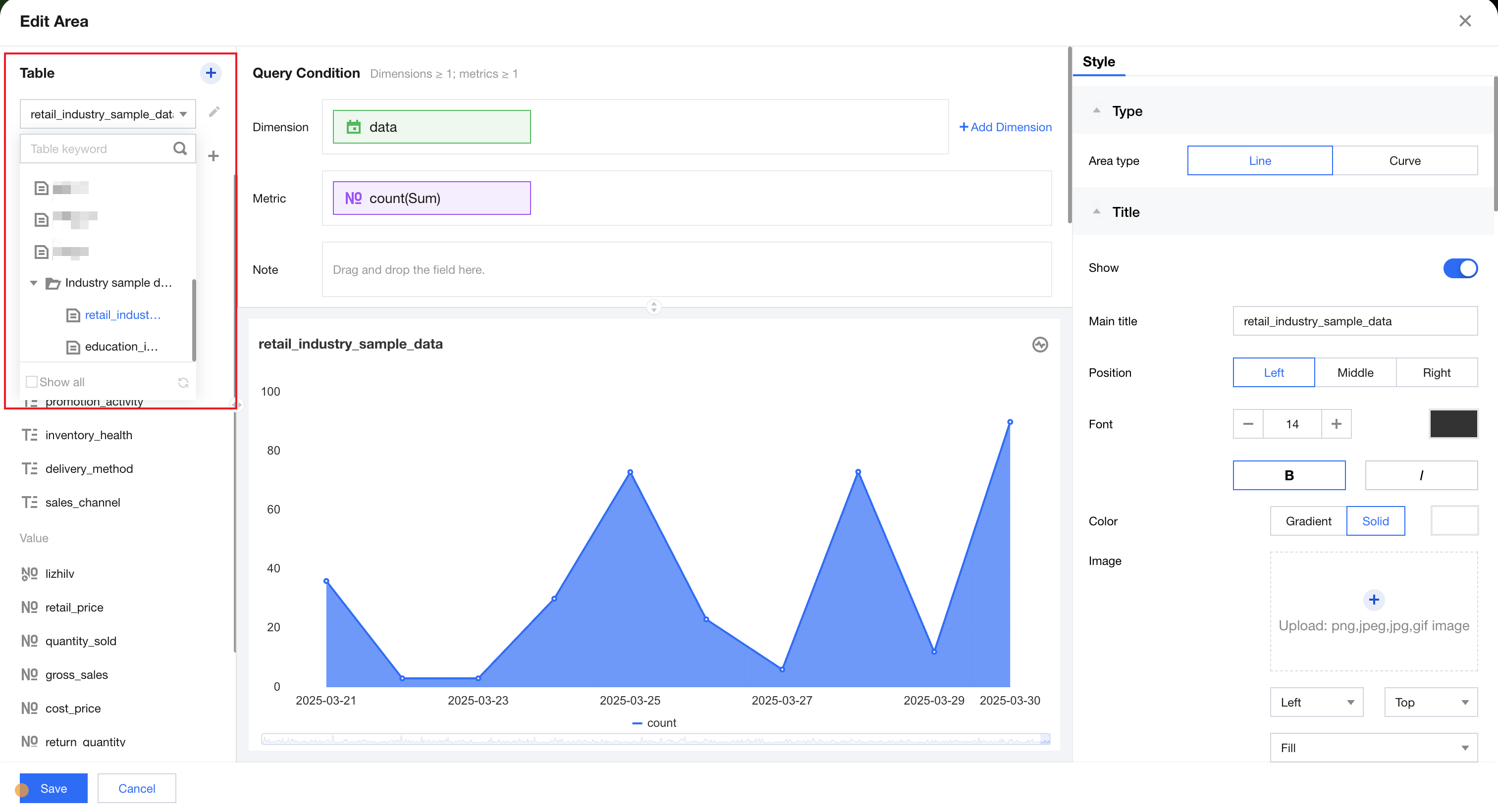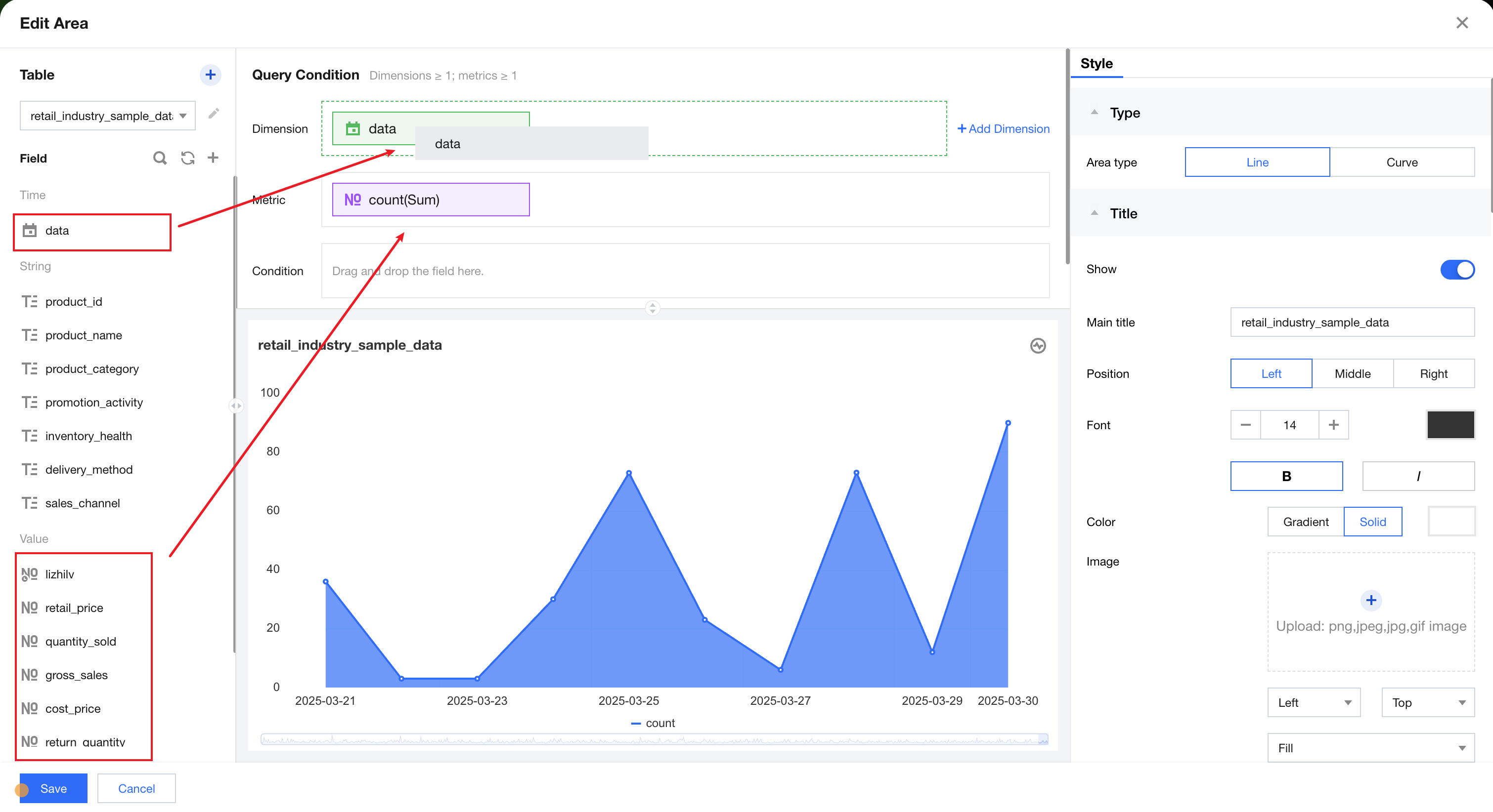 3. Drag and drop a field into the "Dimension" box: After a data table is selected, the system will automatically retrieve all fields under the table and group them by field type.