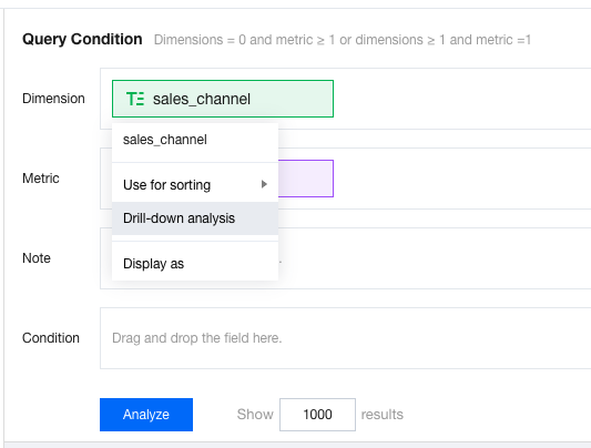 A drill-down dimension area will appear below the dimension area. You can add dimension fields that require drill-down, such as drilling down from a certain dimension to another.