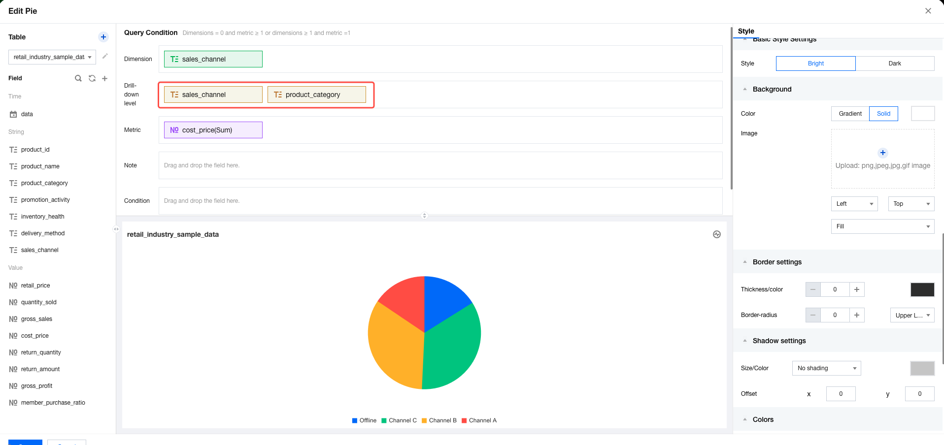 In the chart component configuration interface, hover the mouse over the dimension field and click Drill-down Analysis.