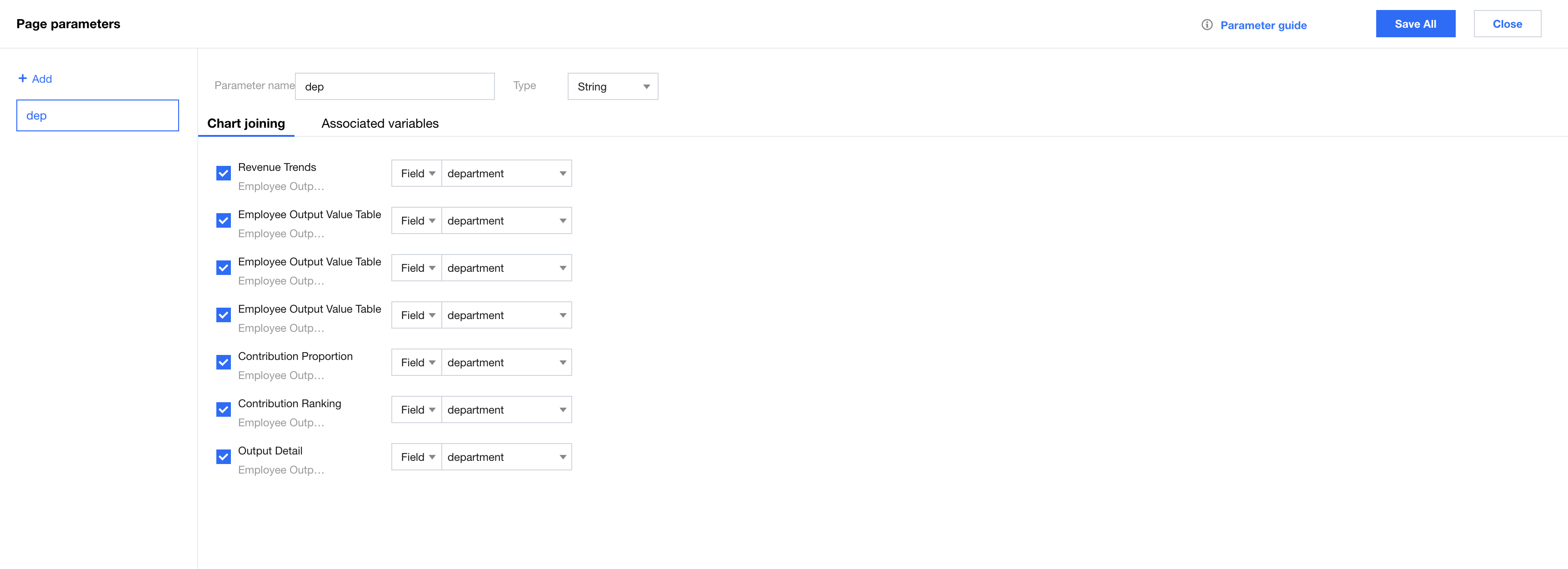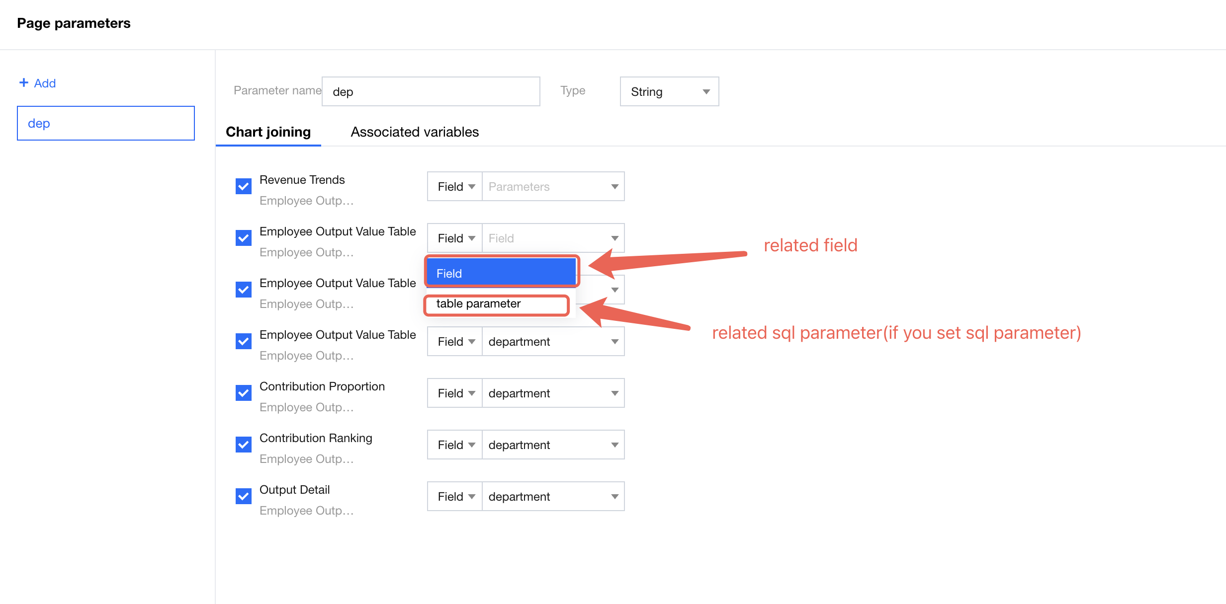 Select the target chart, then select "Field" to pass the page parameter value to the corresponding field of the chart as filtering conditions. The parameter field type should correspond to the type of field. You cannot select a field of a different type from the parameter.