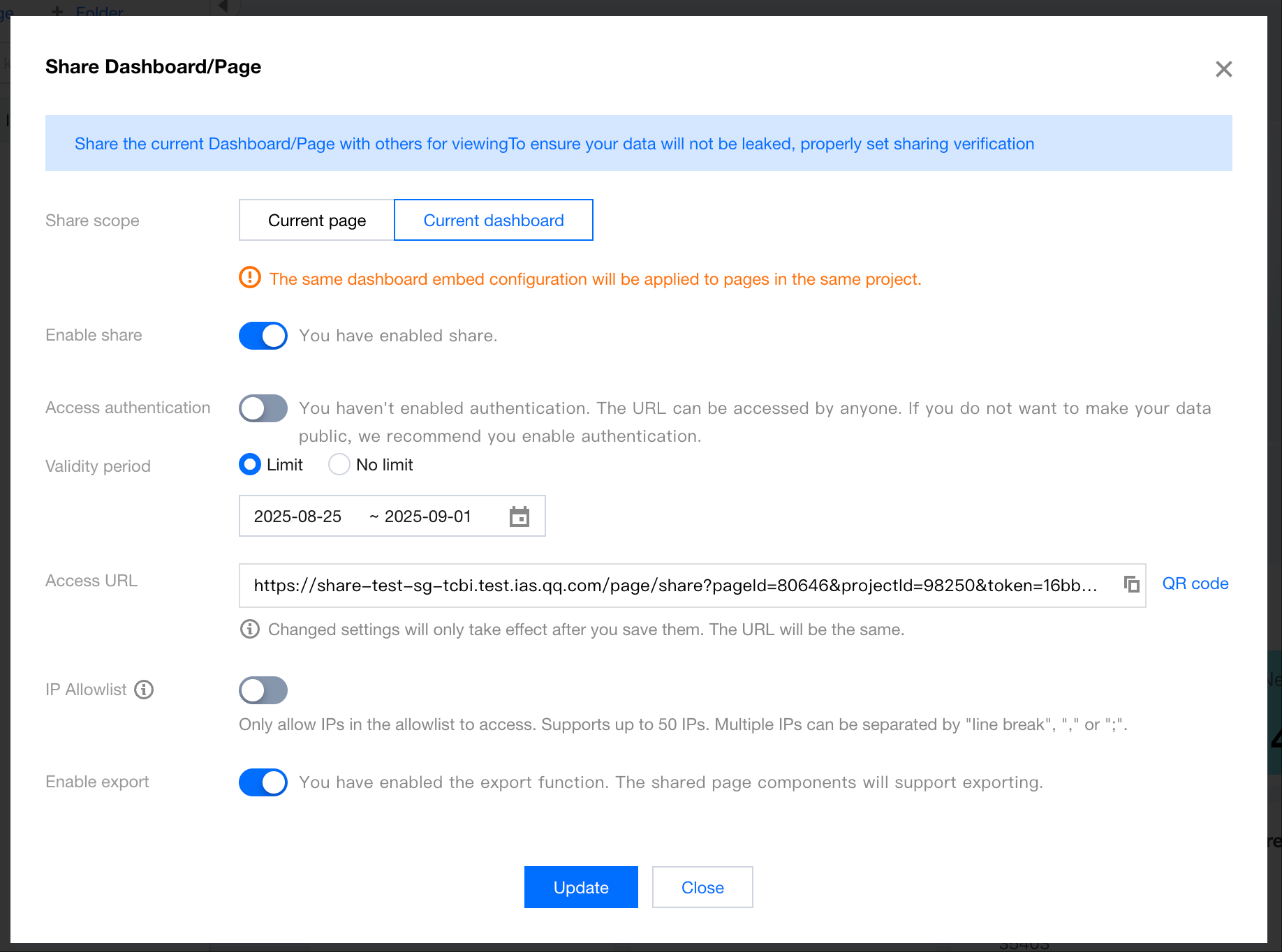 3. At the same time, sharing the entire project's dashboard is supported (requires the project administrator or enterprise administrator roles):