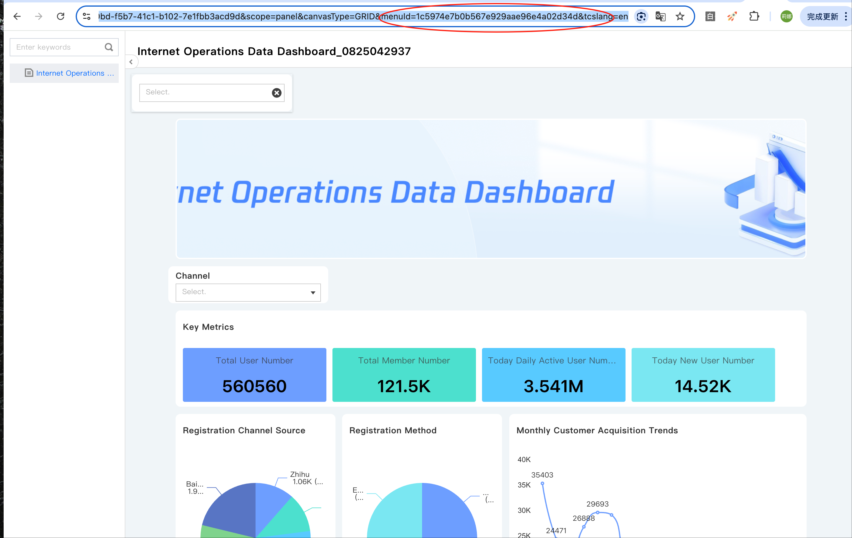 2. Obtain the menuId: Browse the dashboard, click the page, and obtain the menuId from the URL, as shown in the image below.