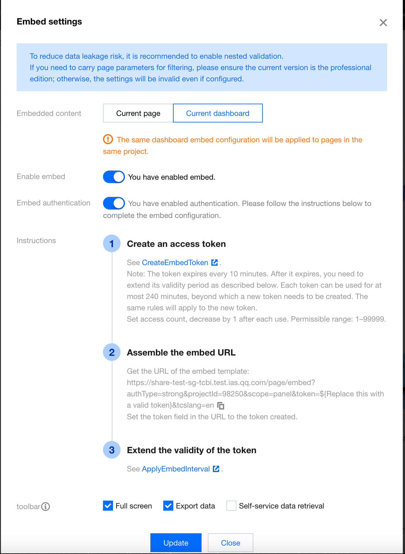 If embedding verification is not enabled, the embedded link may be exposed. It is recommended to enable embedding verification for non-public data to ensure security.