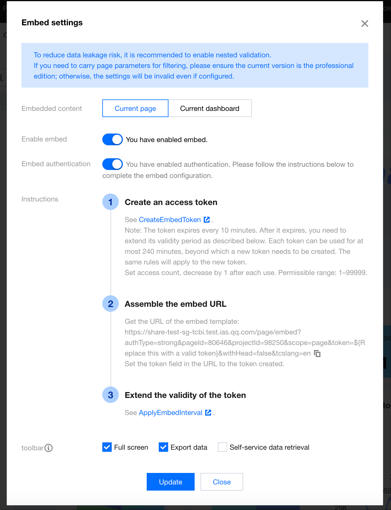 If embedding verification is not enabled, the embedded link may be exposed. It is recommended to enable embedding verification for non-public data to ensure security.