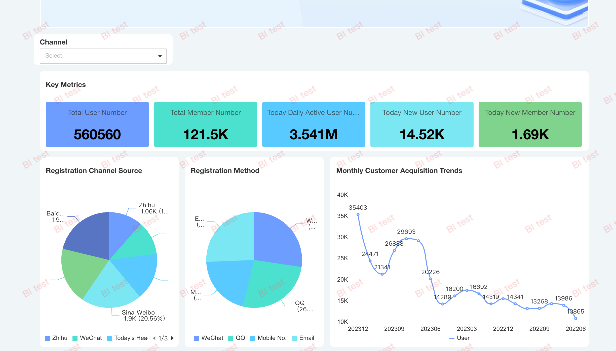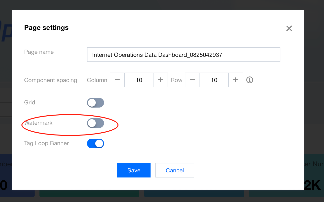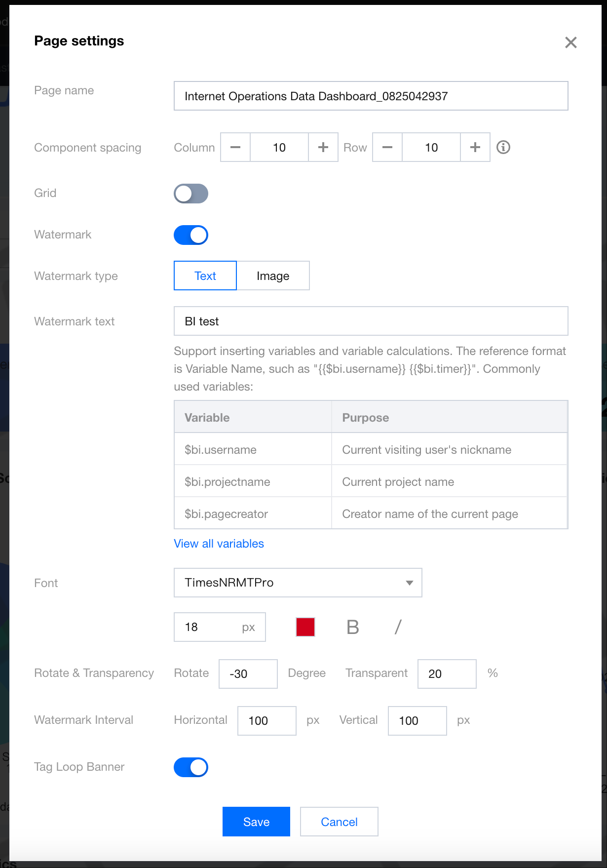 Watermark text | Support both static value input and variable value input based on the interface instructions. | To show "For internal circulation only", you only need to enter "For internal circulation only". To display the current account ID in the report watermark, enter "{{$bi.subuin}}". |