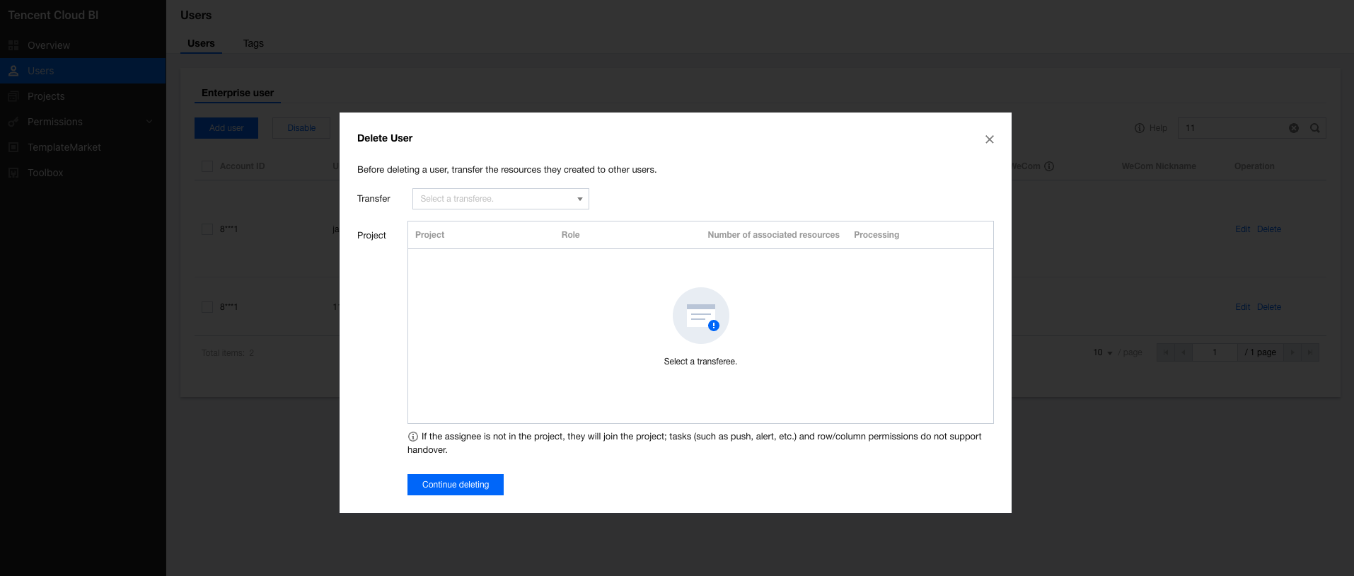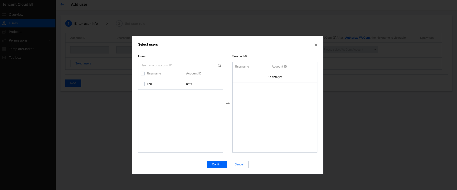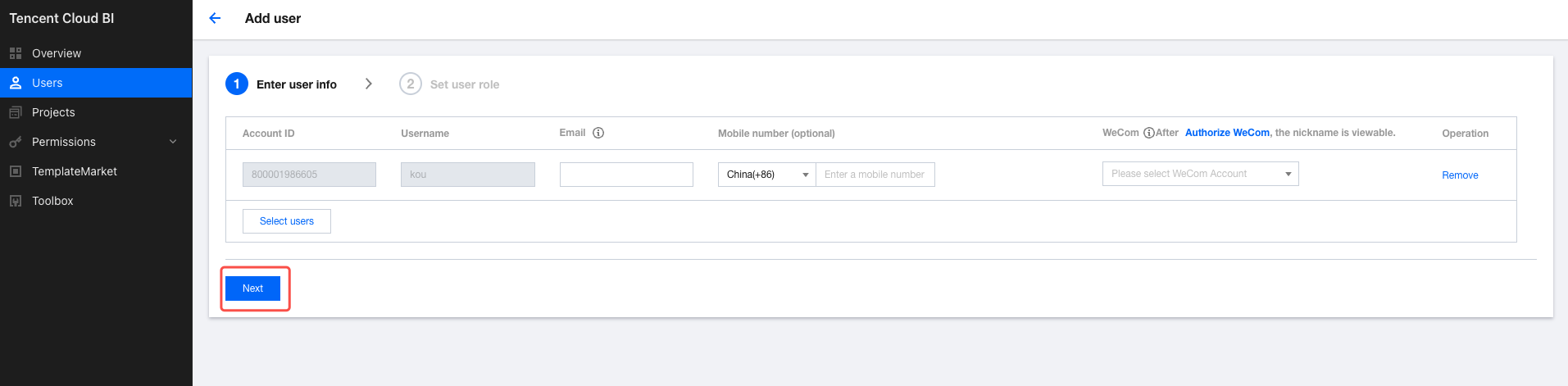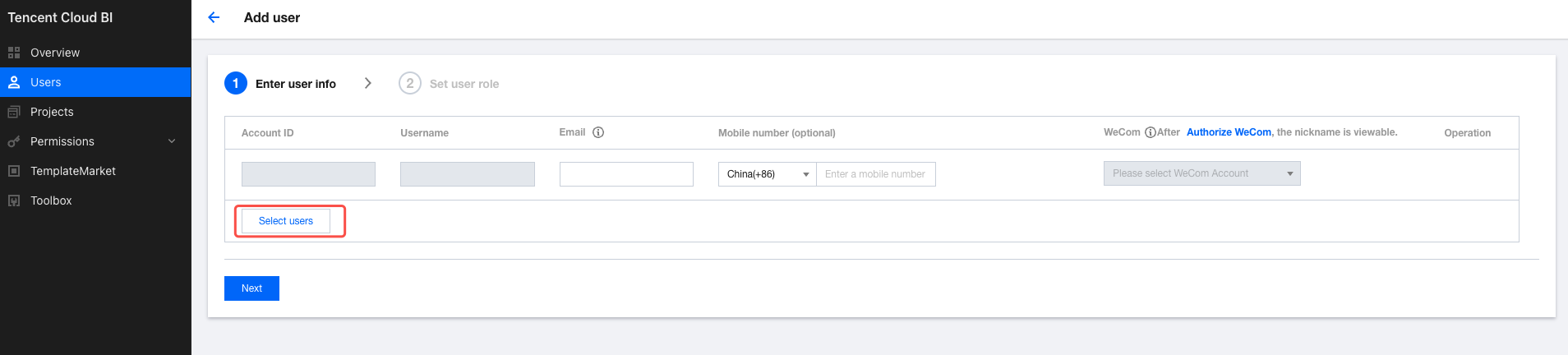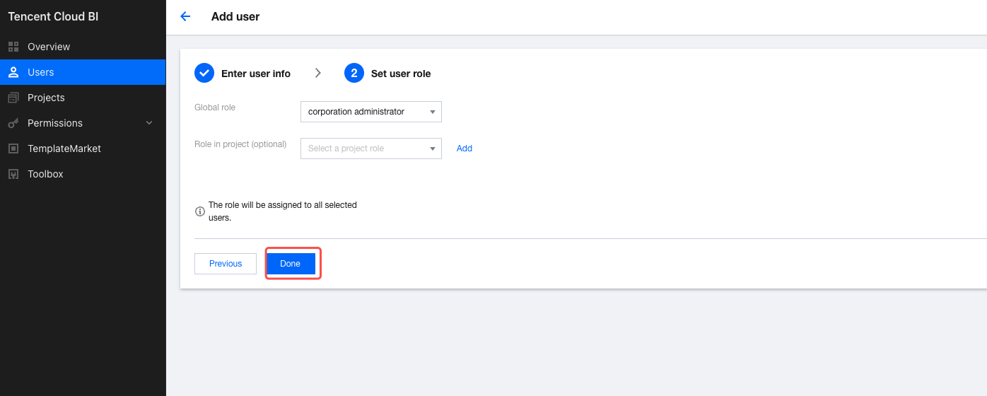 2. Click Add User to go to the user addition page. 3. Click Select Users, select the sub-accounts that need access to BI in the pop-up window. After confirming the selection, click Continue. 4. Configure user roles. Click Done to complete the user addition. Disabling Users