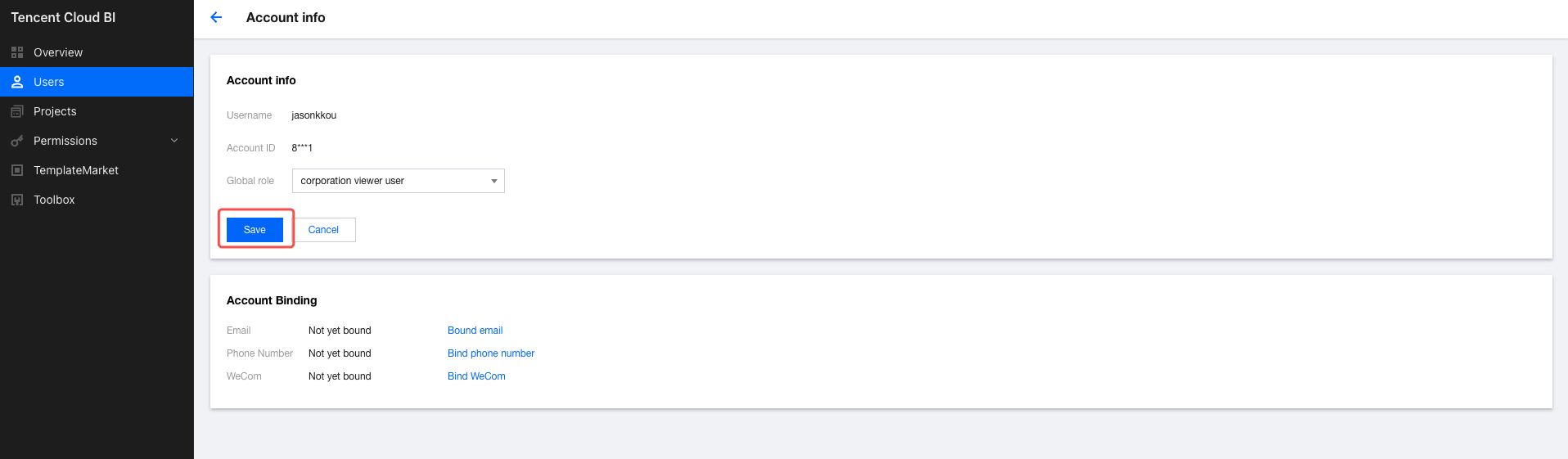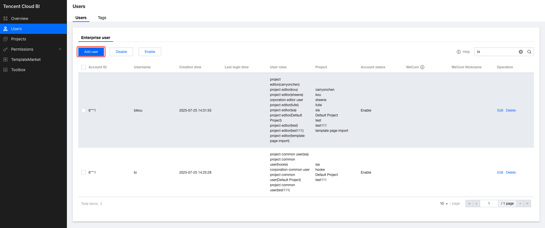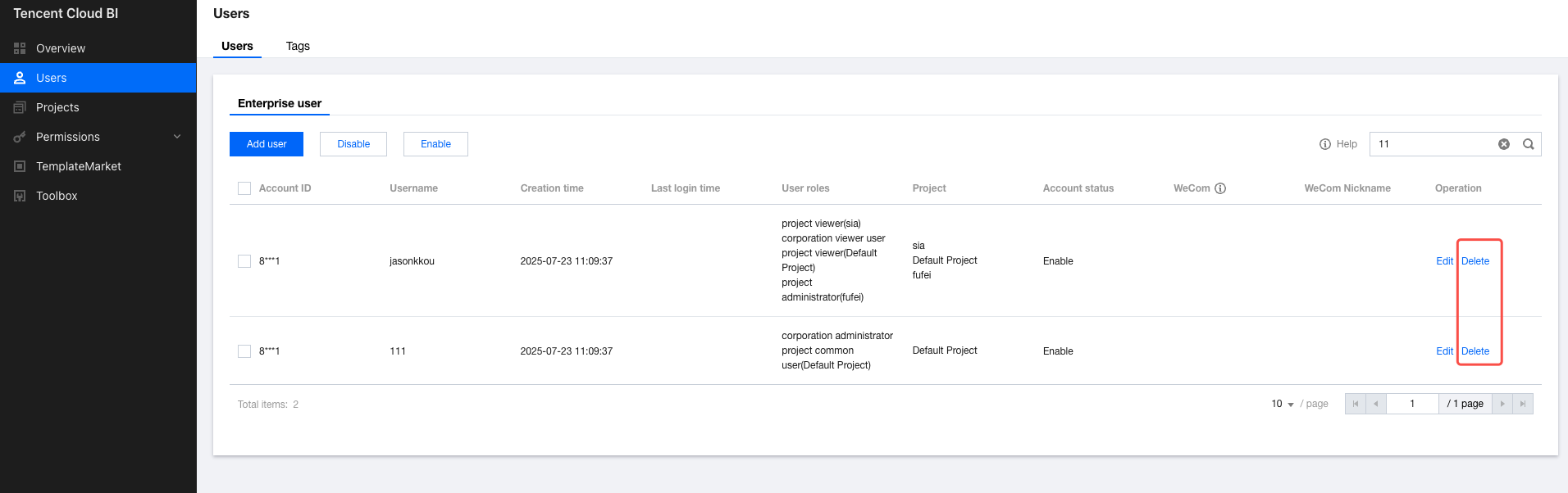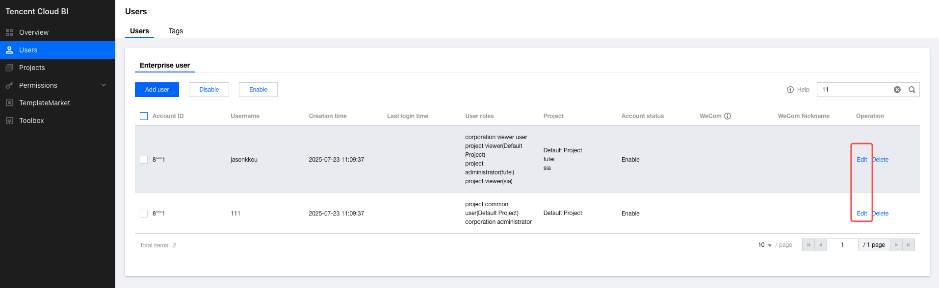 1. Go to the user management page, and click Edit in the operation column of the corresponding user. 2. Go to the account information editing page, modify the user account information, and click Save to apply the changes. (The global role of the root account can only be the enterprise administrator.) Deleting Users