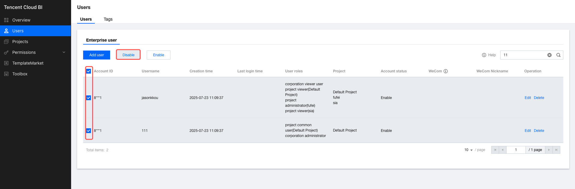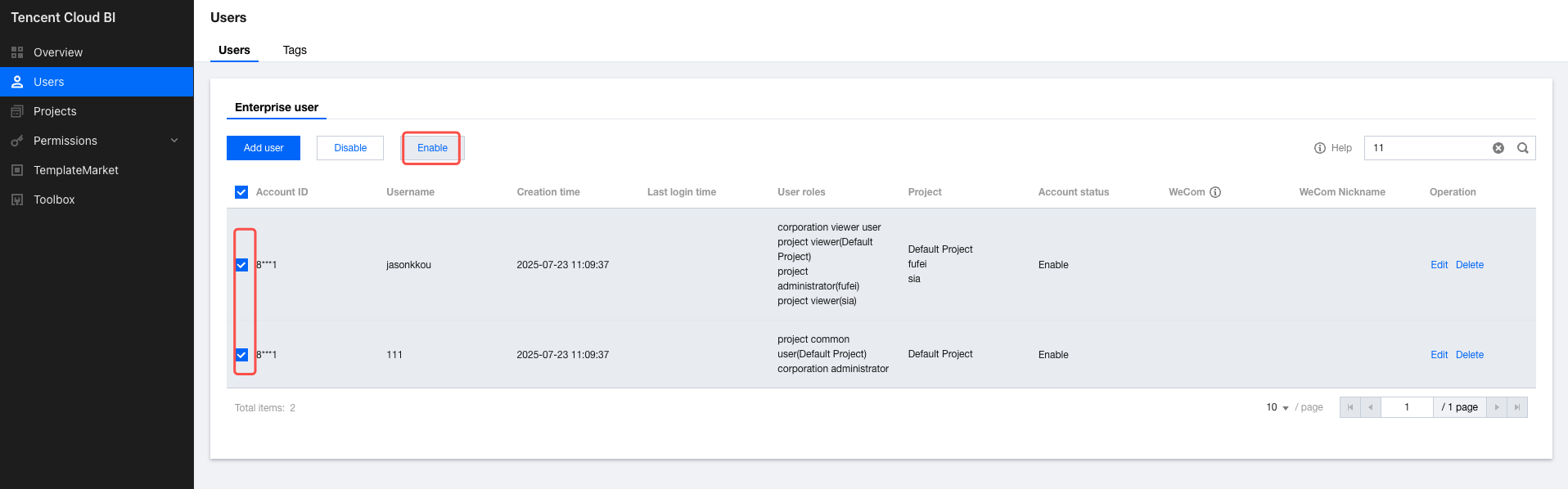 Go to the user management page, select the sub-accounts you want to enable, and click the Enable button.
