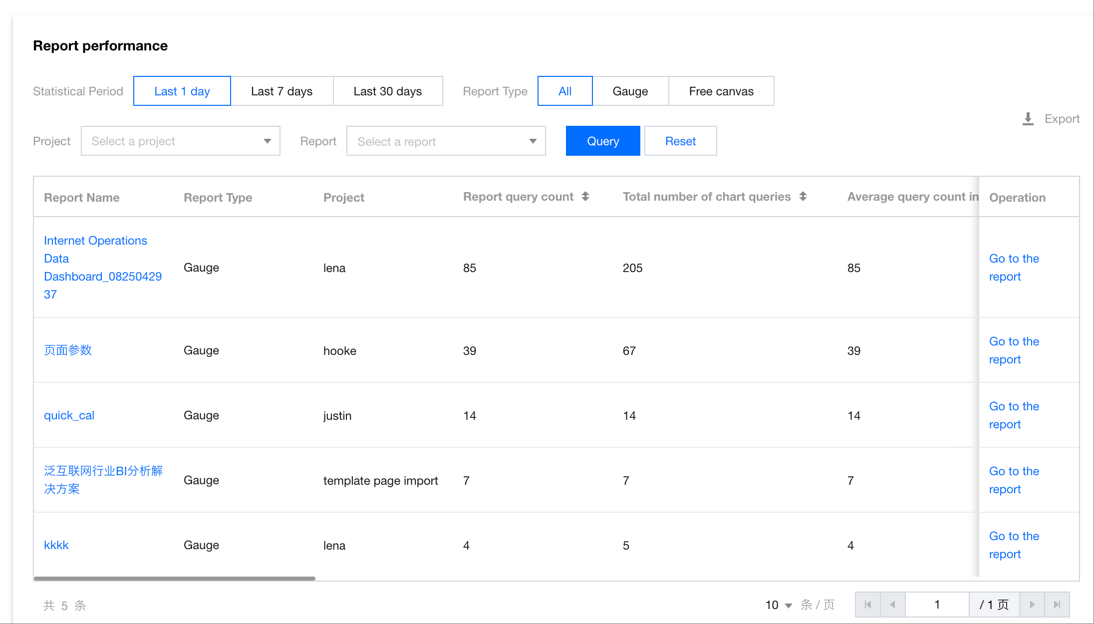 After a report is created and accessed by users, Business Intelligence (BI) provides performance analysis capabilities to monitor metrics, including report query duration, the number of chart queries, and chart query time.