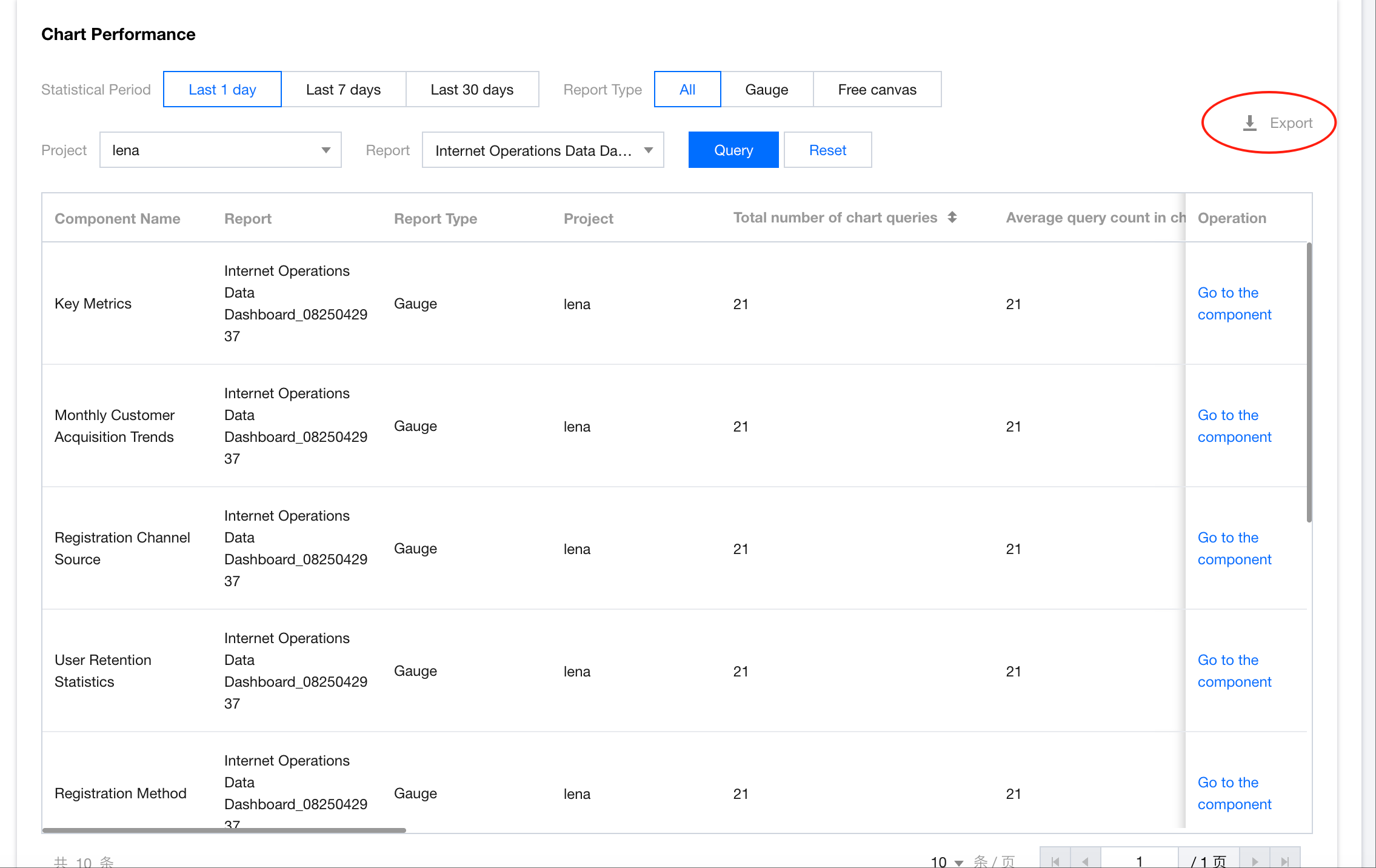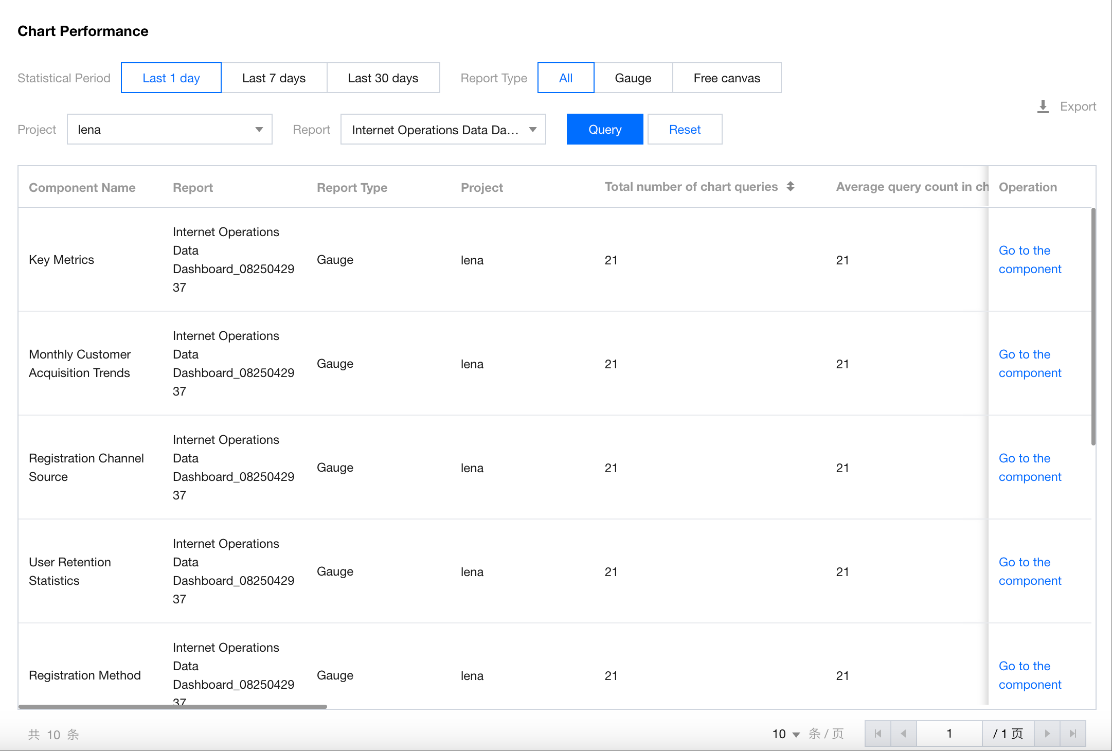 Chart refresh query count: The number of query requests triggered by refresh actions for charts under the report during the selected time period.