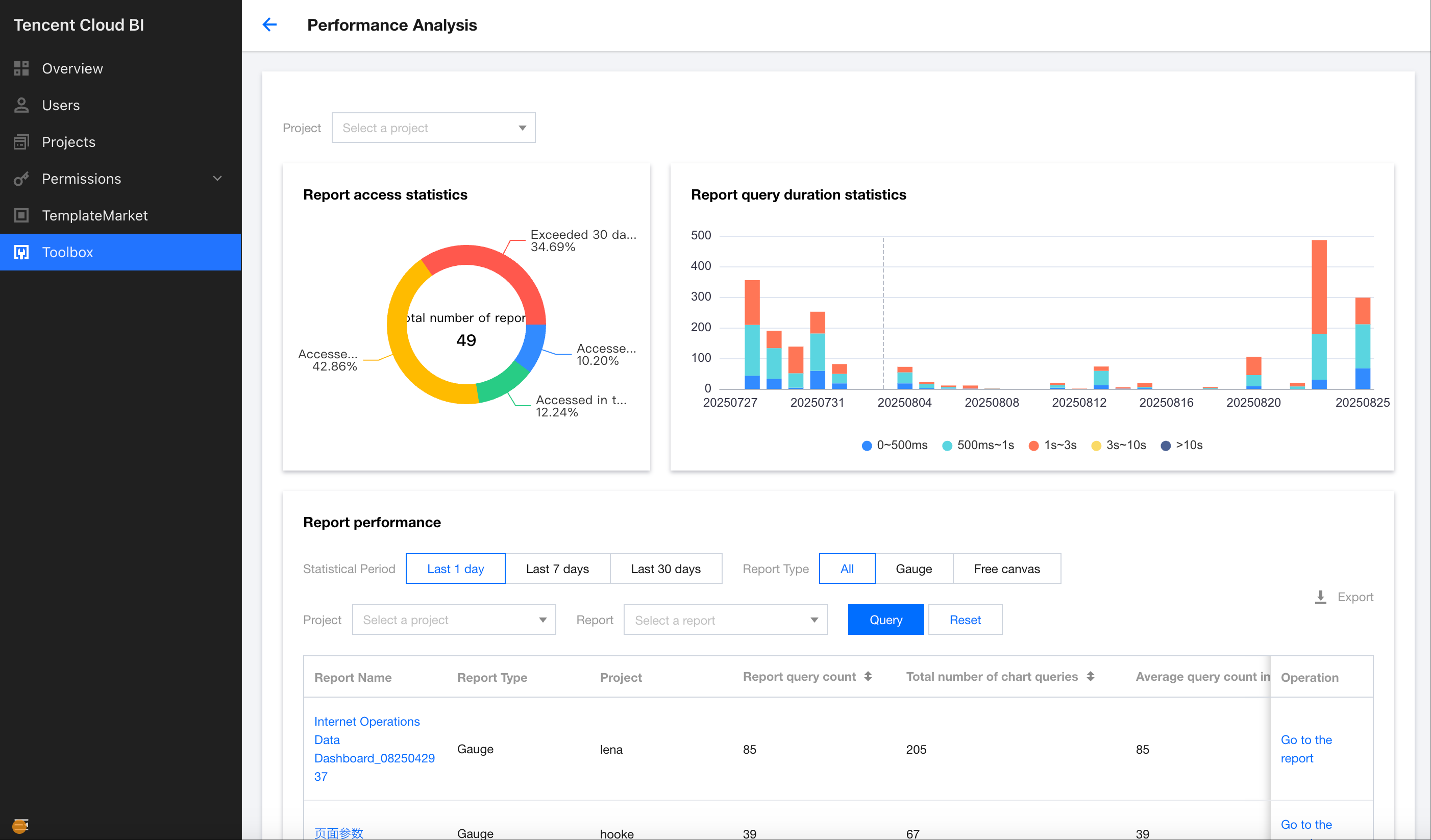 View all resources performance: Log in to BI console > Toolbox > Performance analysis. View project resource performance: Log in to BI console > Project Management > Select a project > Performance analysis. View chart performance in the canvas: Go to the page editor > hover over the chart > select Performance analysis in the toolbar.