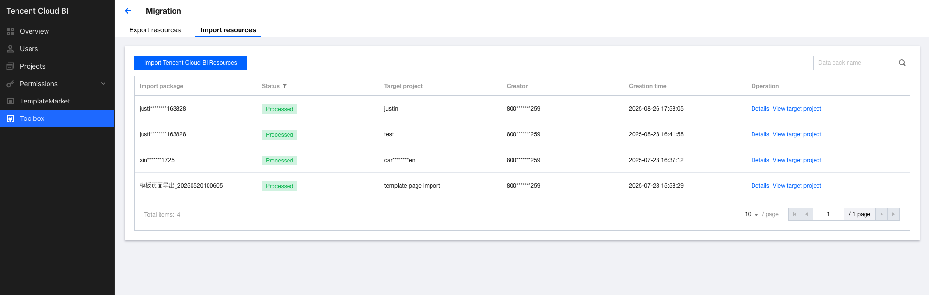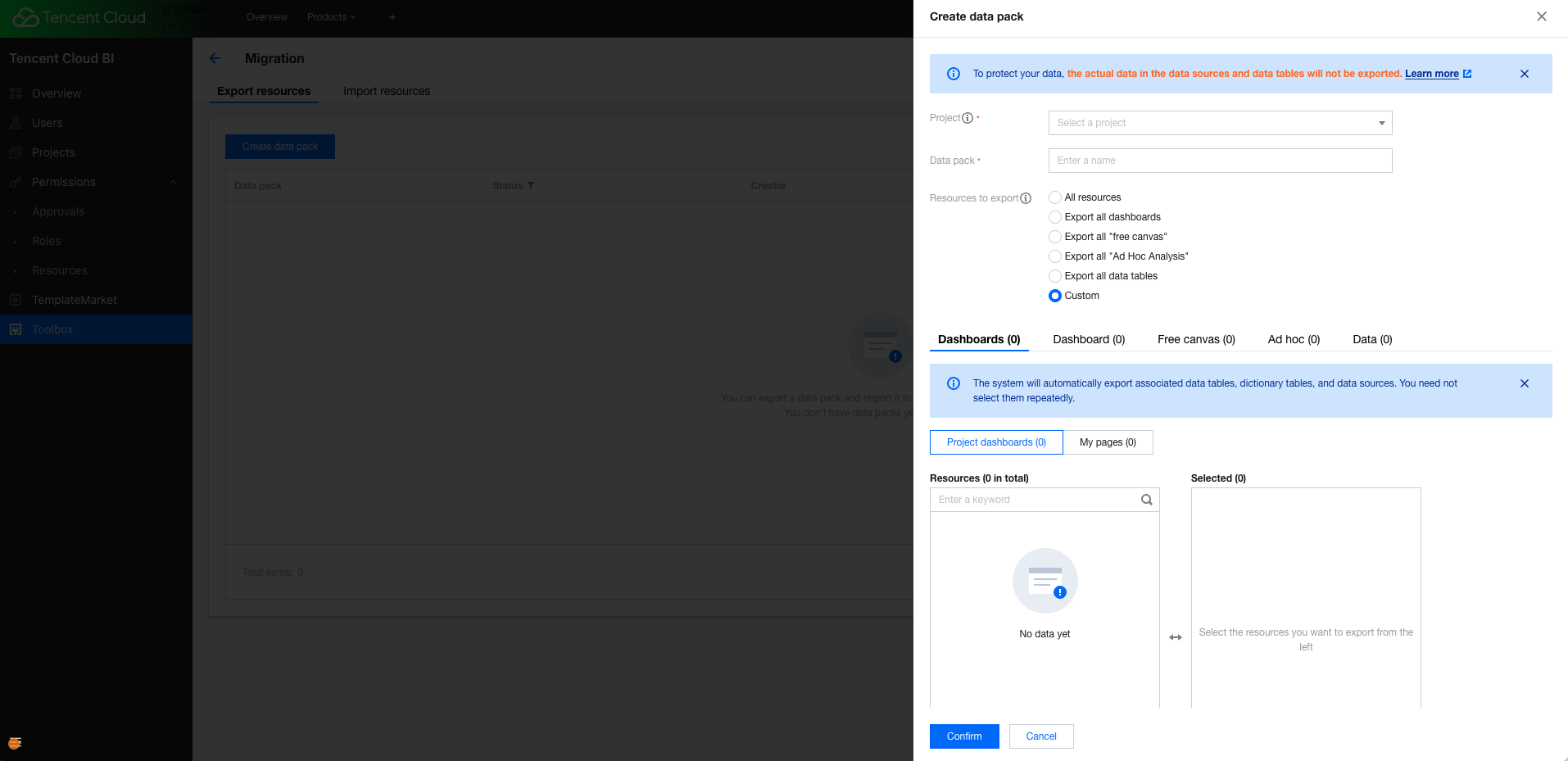 The Business Intelligence (BI) resource migration feature enables the migration of specific resources (dashboards, pages, and data) across projects, accounts, and environments. This feature supports use cases including project migration, page reuse, and resource sharing. A complete resource migration involves resource export (selecting projects, specifying resources, generating resource packages, and exporting resource packages) and resource import (selecting projects, uploading resource packages, and connecting data sources).