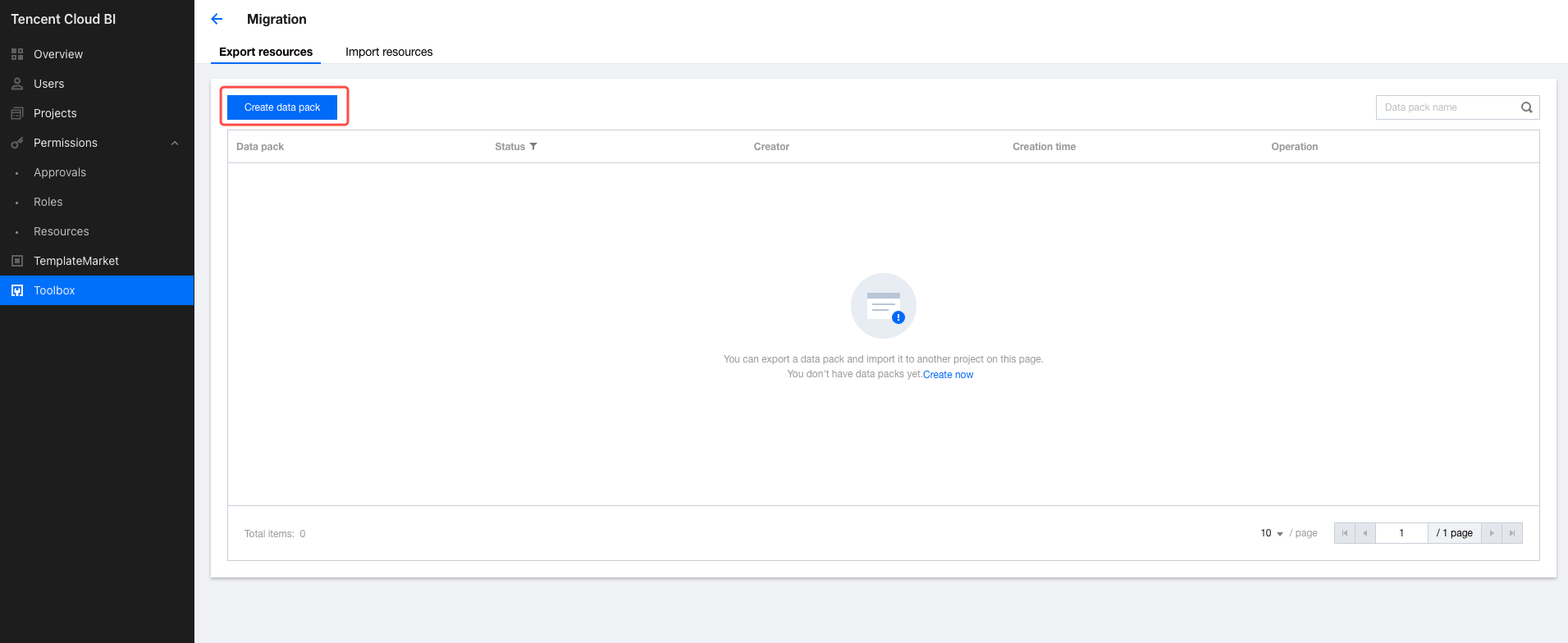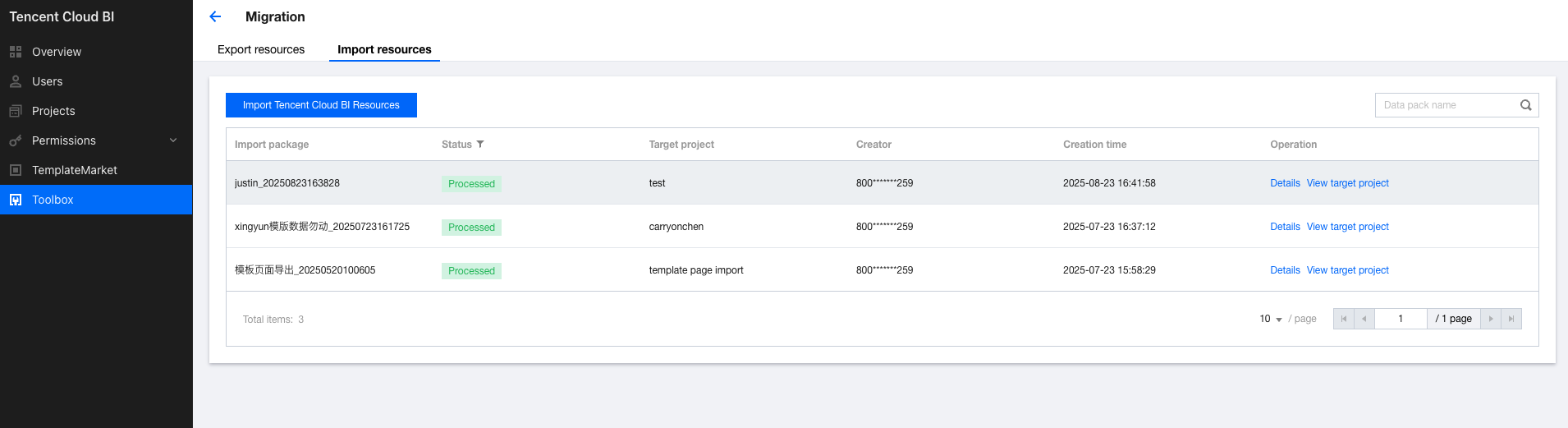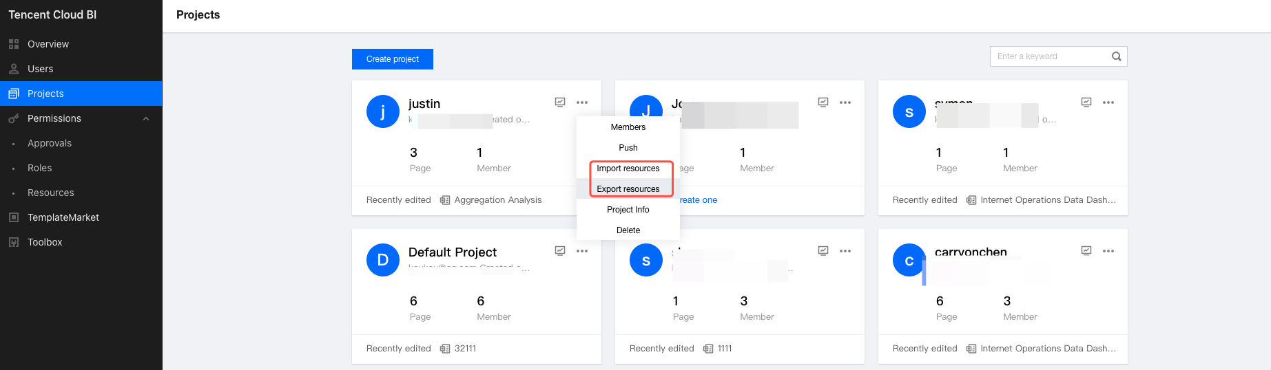 1. Go to the "Resource migration" feature in the "Toolbox". 2. Select resource import and resource export through "More Operations" in the project (only the enterprise administrators or project administrators can perform this operation). Resource Export