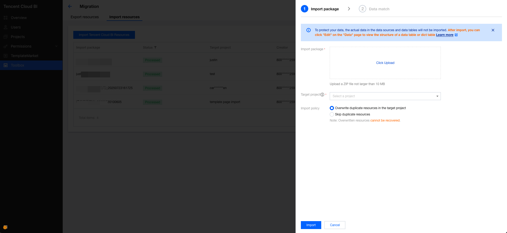 1. Switch to the "Resource Import" page in the toolbox to create an import task. 2. Upload the resource package file (in .zip format) and select the project to which the resources will be imported. Different policies are supported for handling duplicate imports.