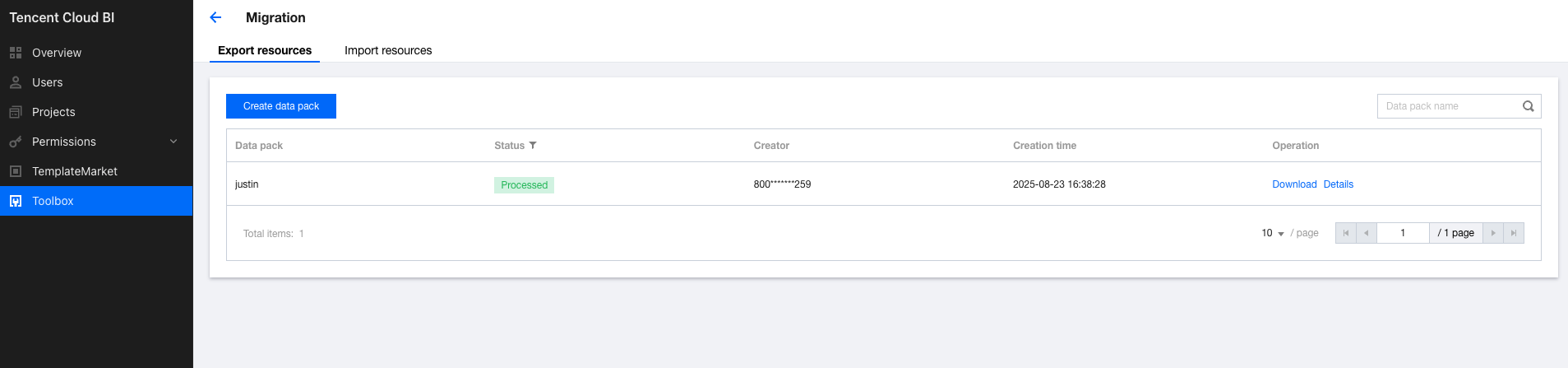After confirming the export range of the resource package, a corresponding "Processing" record will be added to the export list. You can refresh the list to check whether the resource package has been processed. Once processing is complete, you can proceed with the download.