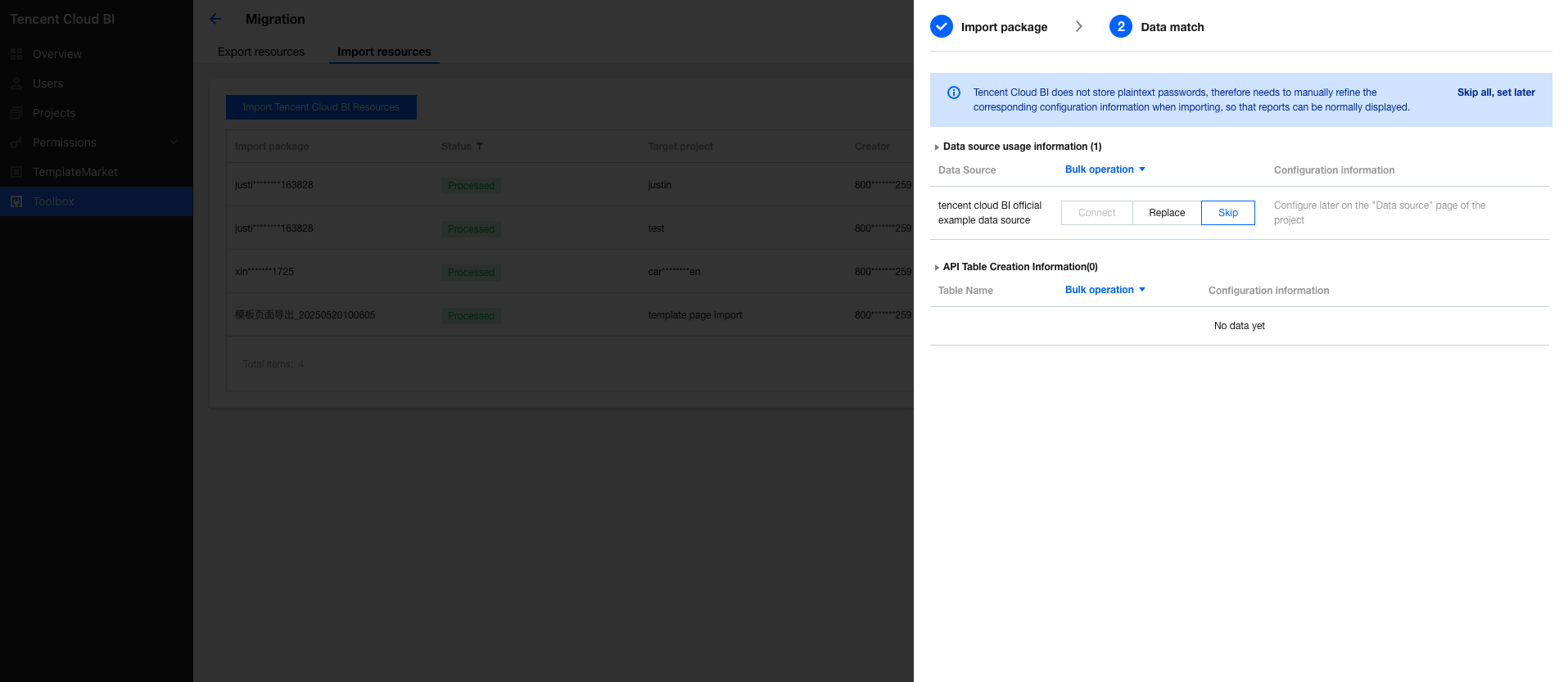 Once all fields are entered, click to start the import process. 3. After the import is complete, quick data source matching is supported (choose to skip if you do not need to connect to a data source on this page for now). To ensure user data security, the exported resource package contains no important information about the data source connection. Users need to complete the missing information to restore the data connection and enable full page display. The system provides 3 methods for data source matching.