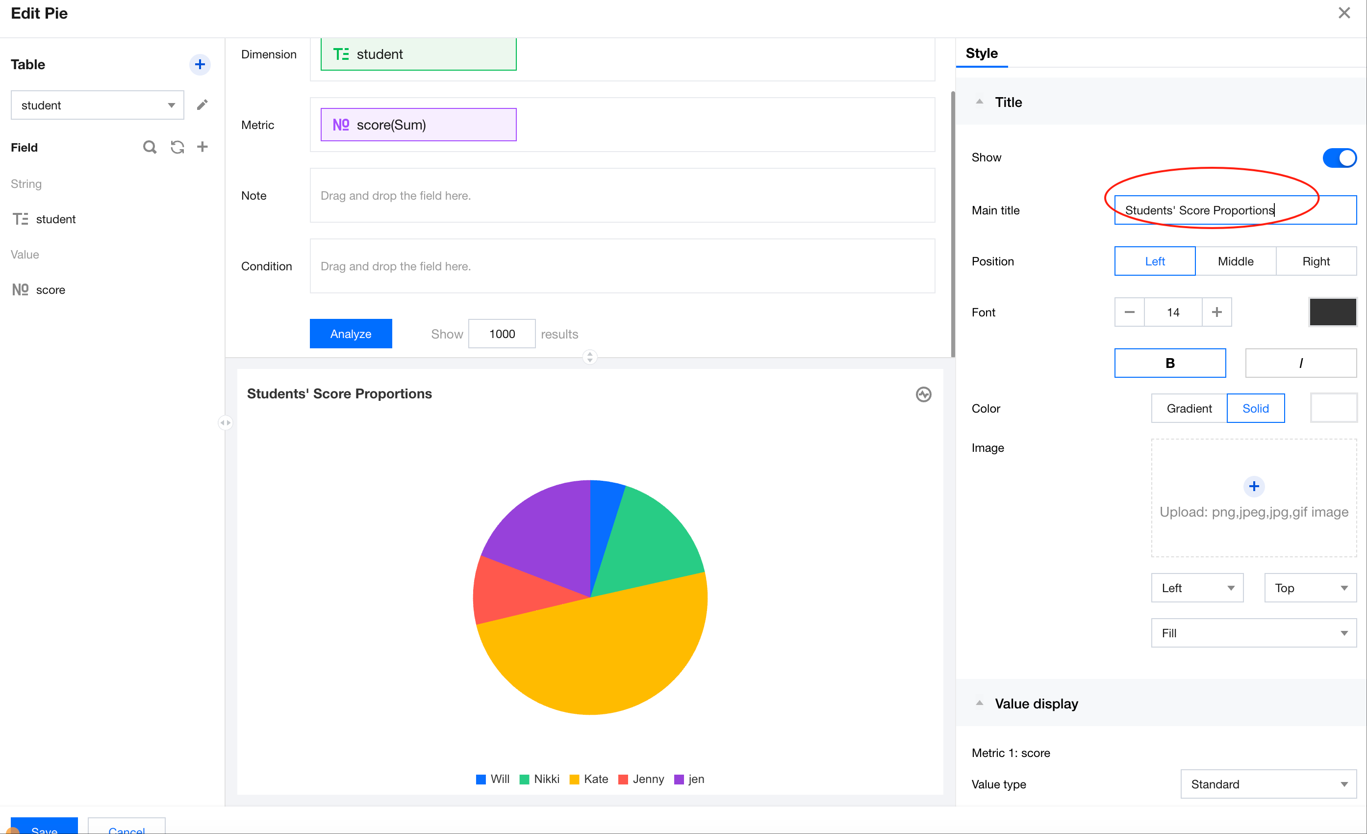 In the title area on the right, enter the title text "Students' Score Proportions" and update the title.