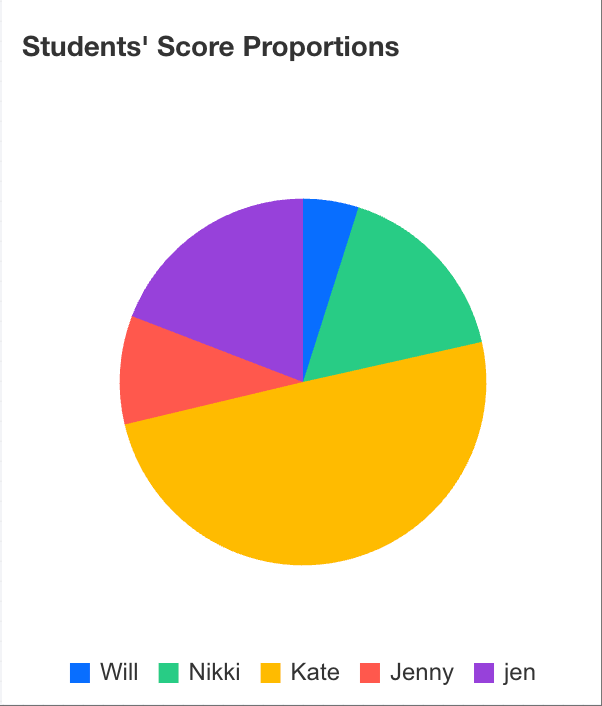Proportion analysis usually adopts pie charts (or donut charts). A pie chart displays the relative size of each part within a data series as a proportion of the whole. Each slice in a pie chart represents the proportion of a specific item. The following example introduces how to create a proportion analysis chart using students' score proportions.