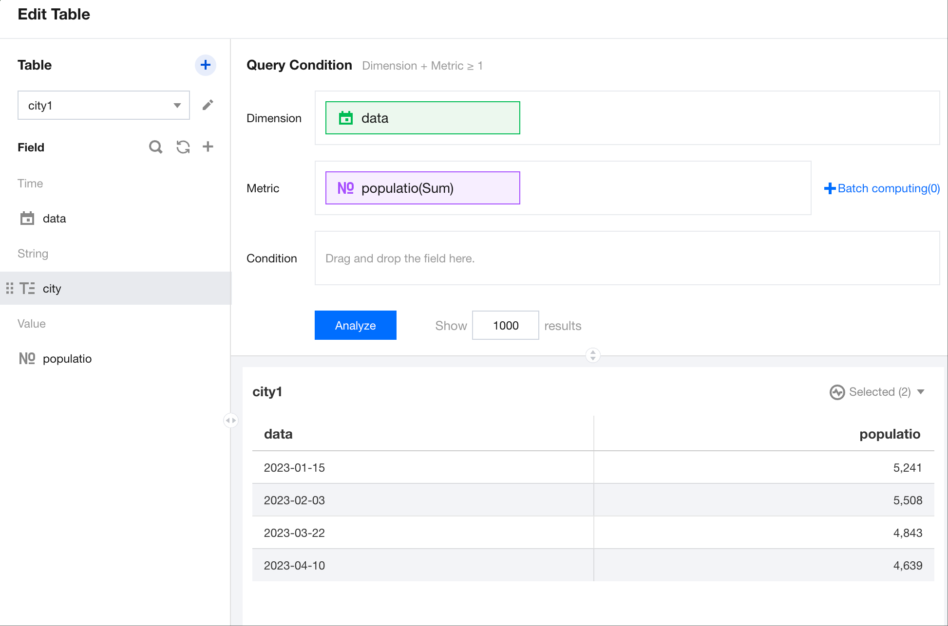 After selecting the data table, drag and drop fields to the dimension and metric areas to generate the following table.
