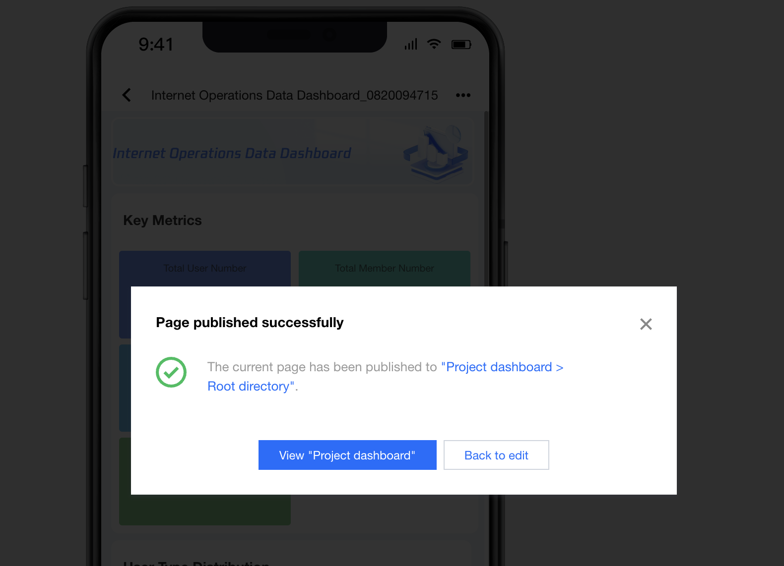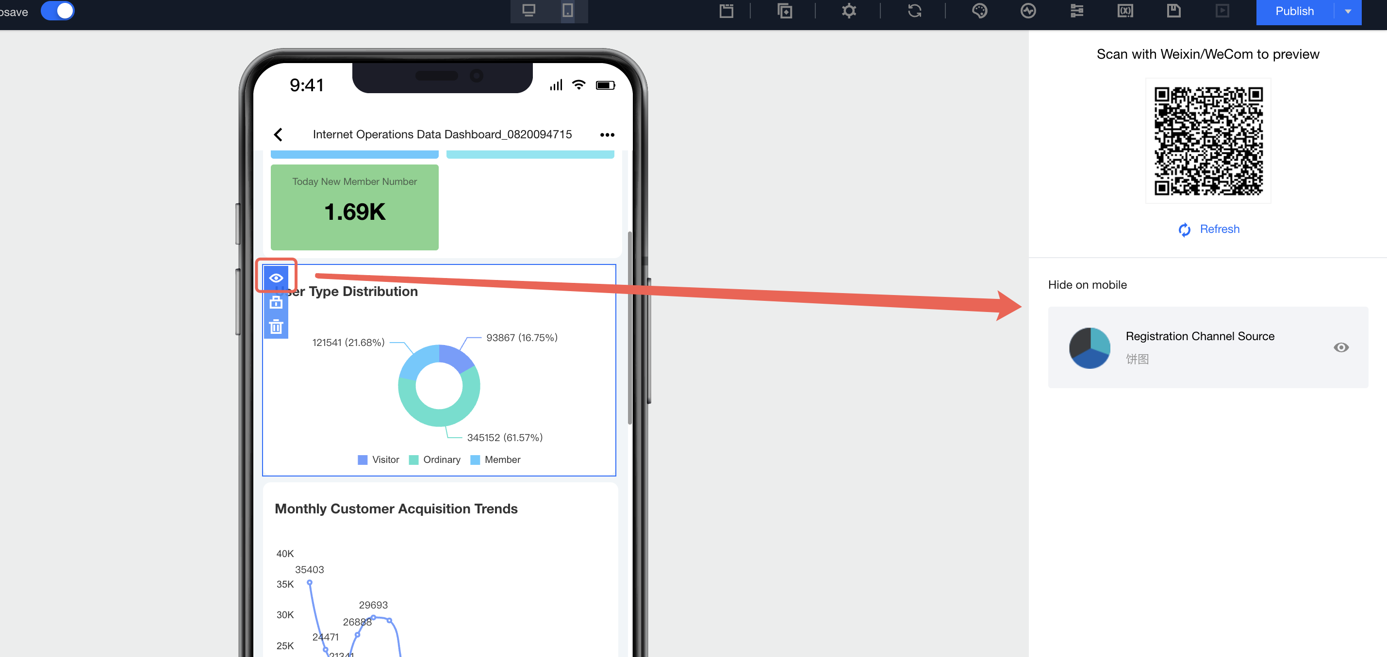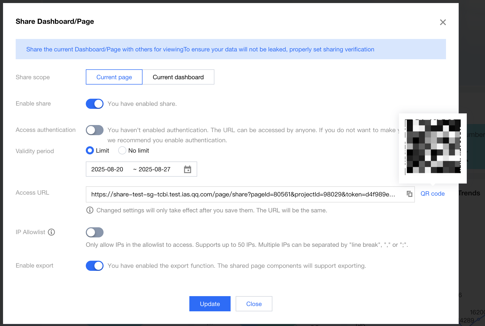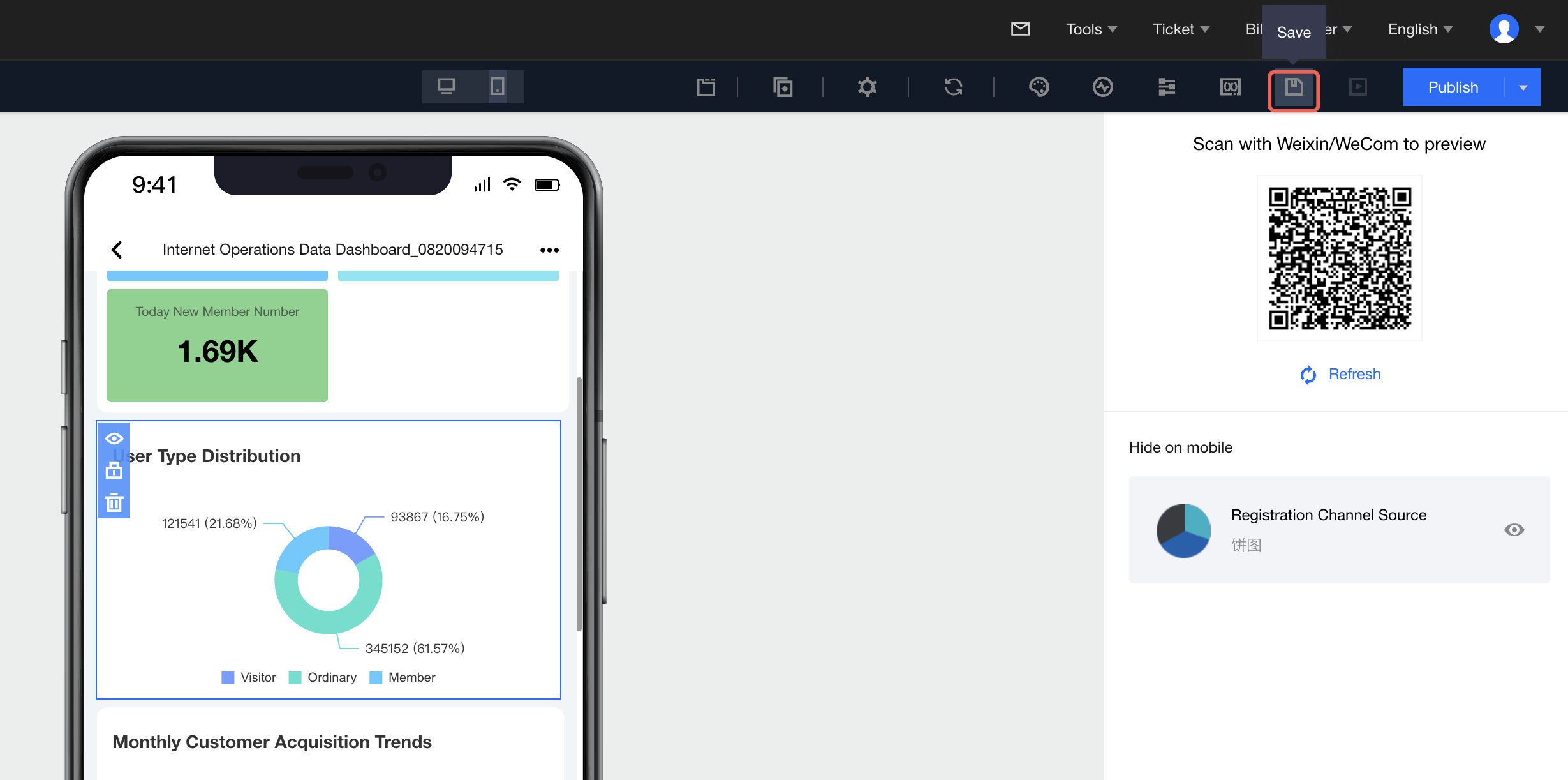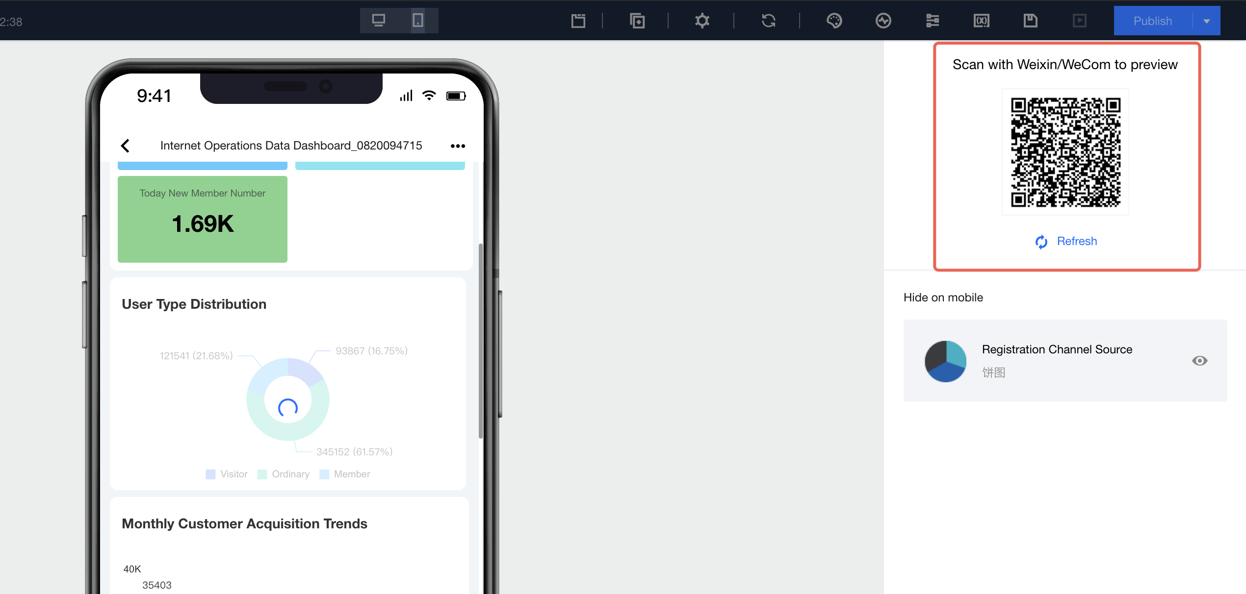 2. After successful release, click View Dashboard to enter the dashboard. 3. After entering the dashboard, click Share, then click QR code on the right of the access link to scan and view the mobile report: 4. Mobile terminal link retrieval: