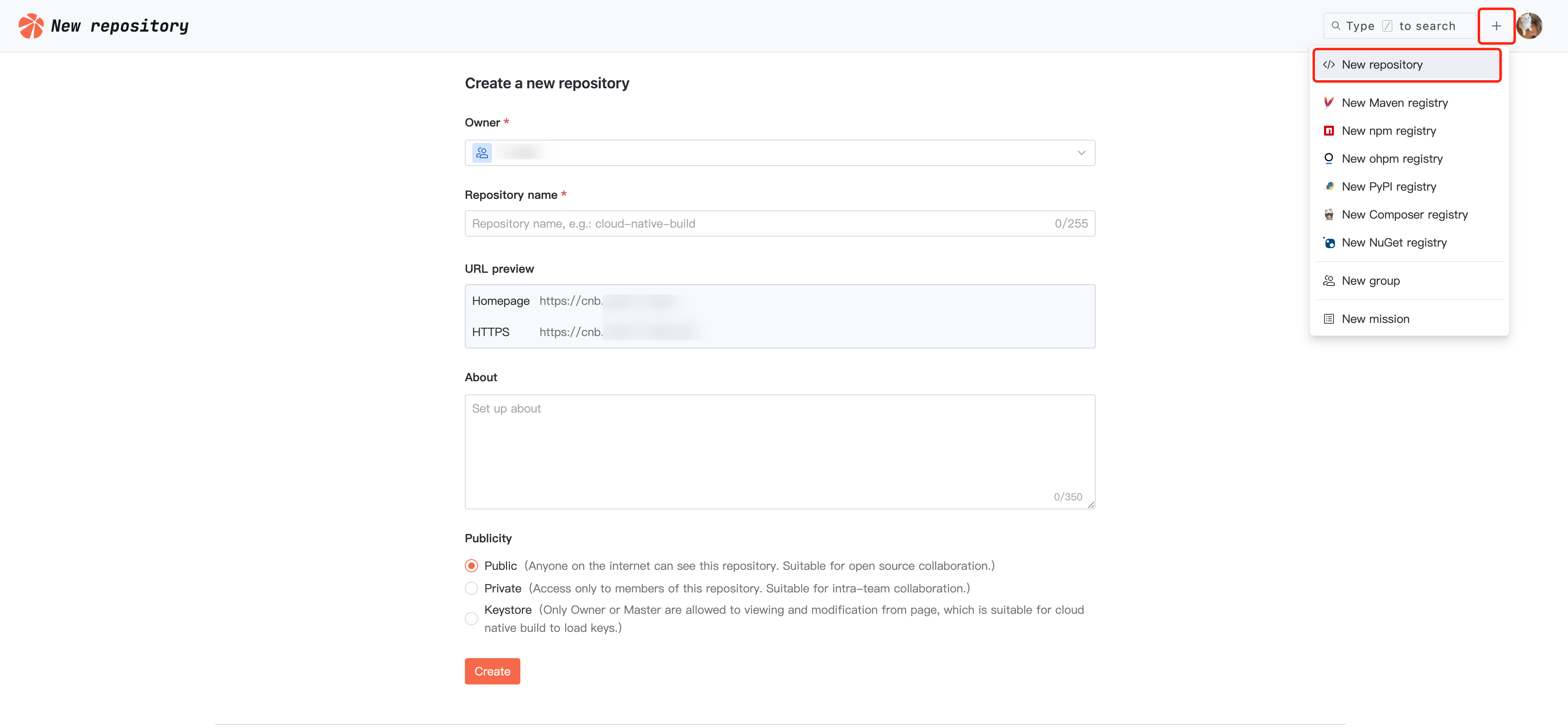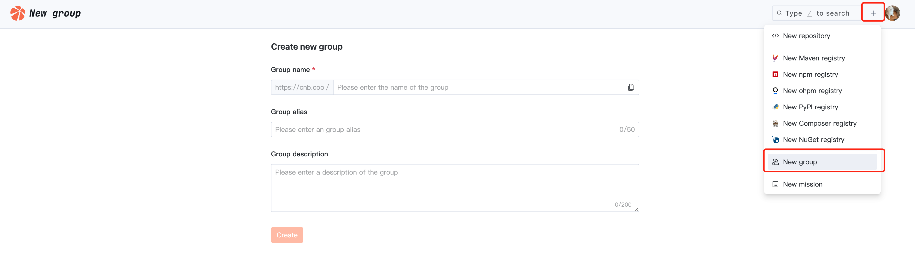 After entering CNB, click "+" in the upper right corner, select New group, fill in the organization name and related description, then click Create to complete the organization creation. Creating a Repository