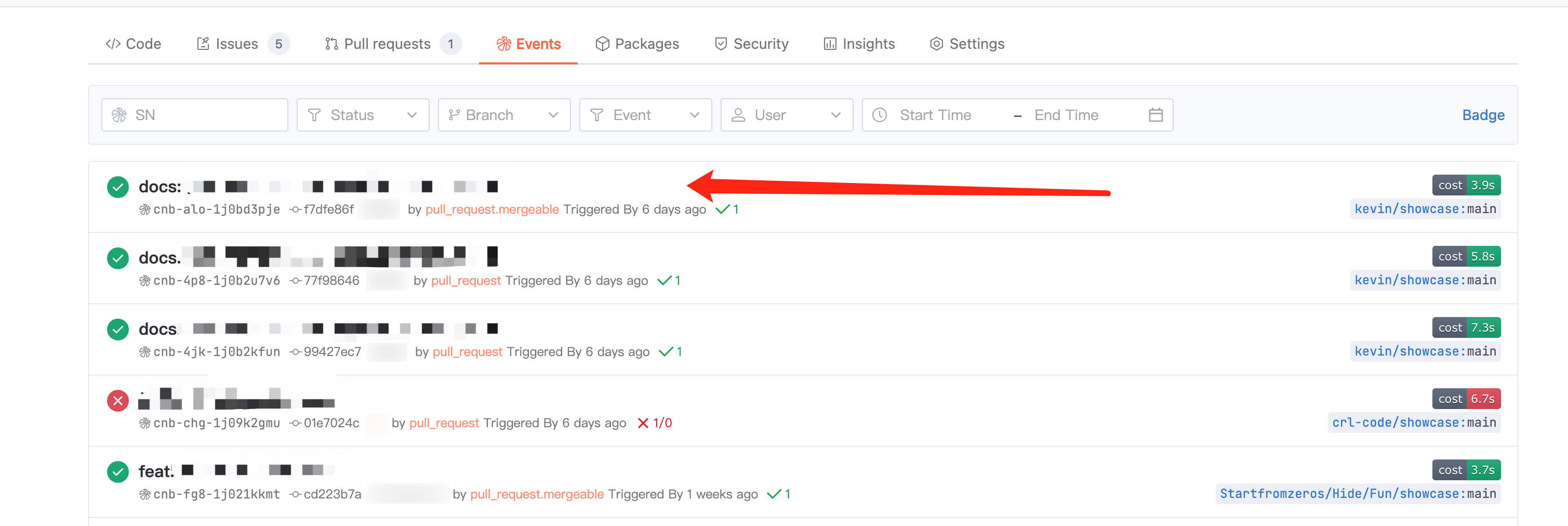 On the warehouse page, click Events to see the build list. The latest one is the pipeline triggered by the push event just now. The record with a loading flag below corresponds to the Cloud Native Development build.