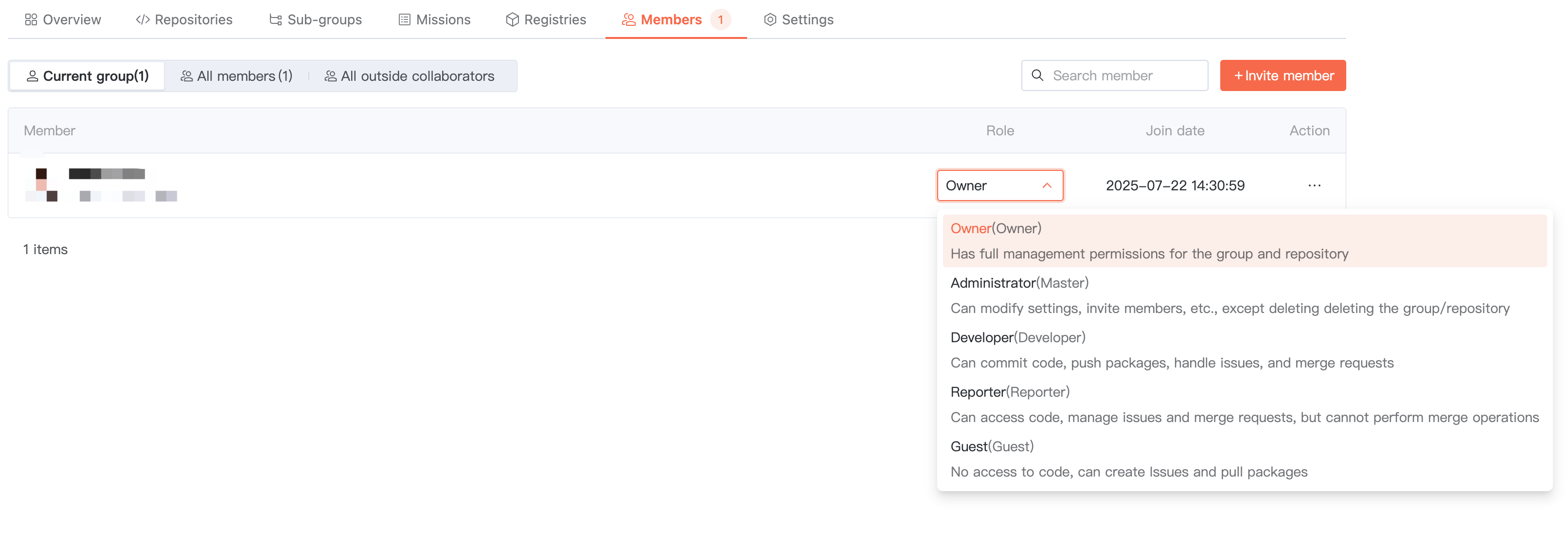 CNB grants access by role, fixed as five roles. Sub-organizations, repositories, and artifact repositories automatically inherit member permissions from the parent organization.