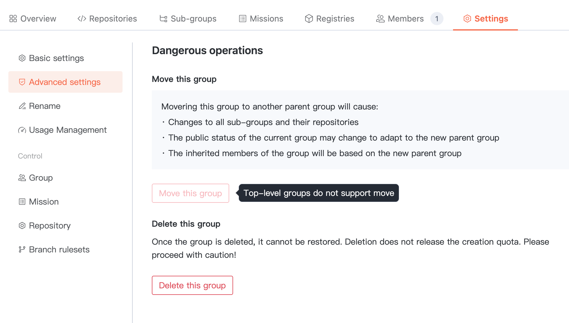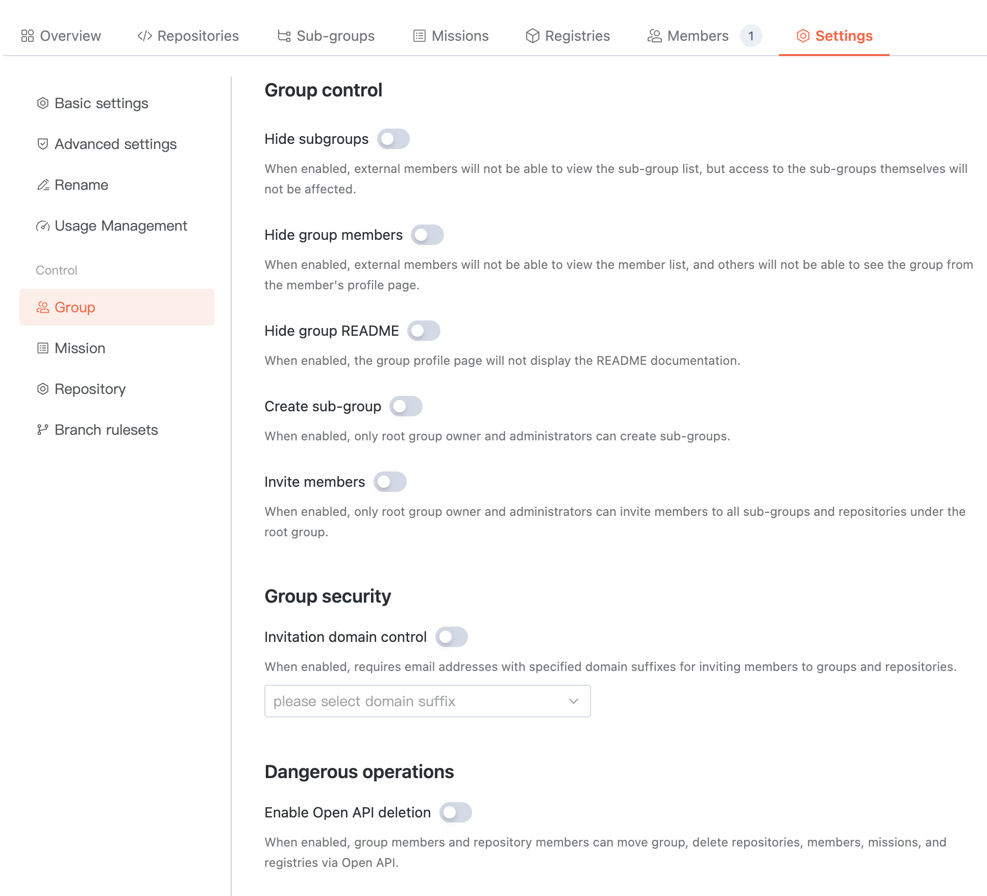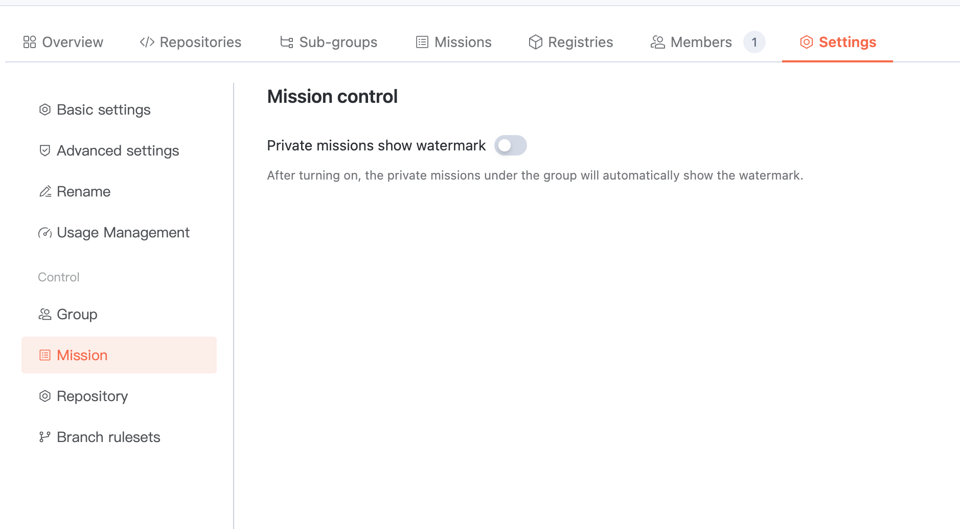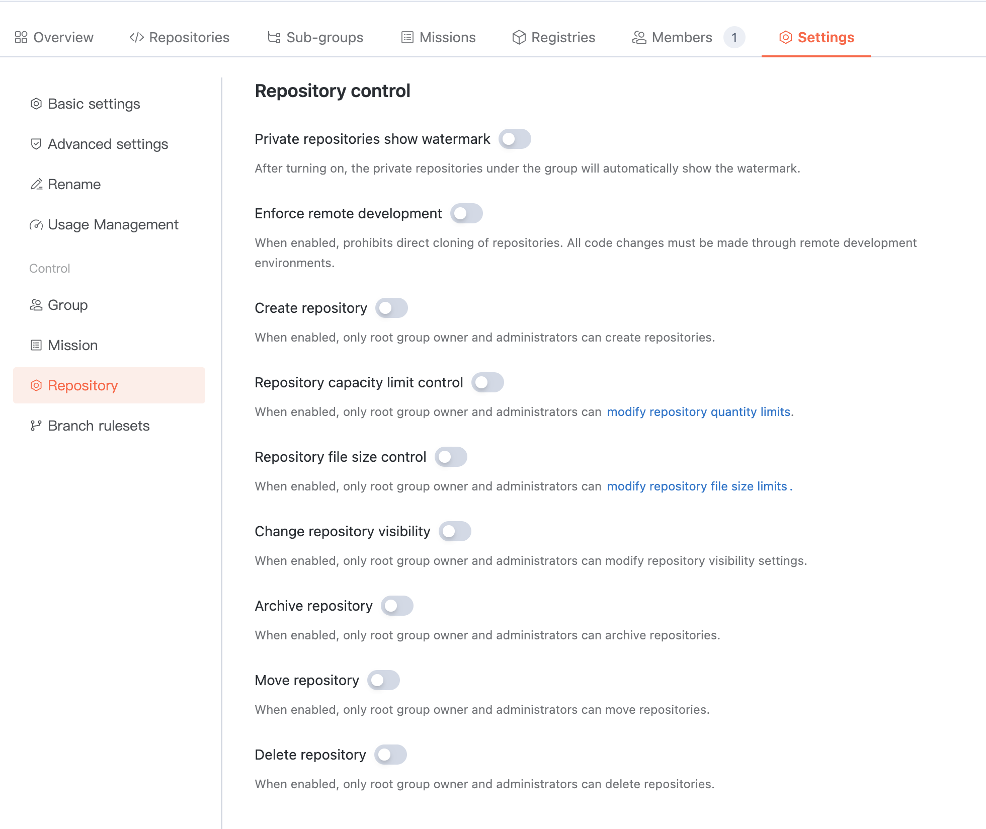 Support control over repositories under the organization, for example, private repositories automatically display watermarks, only root organization admins and owners can create repositories, and only root organization admins and owners can change repository visibility.