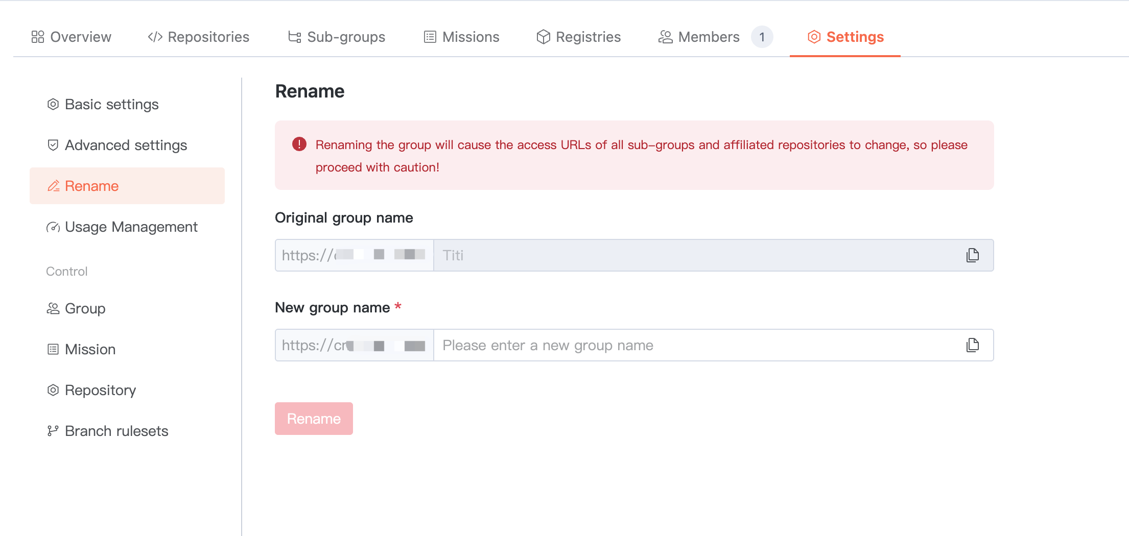 Note that changing the organization name will cause the access URL of ALL sub-organizations and assigned repositories to change. Proceed with caution.