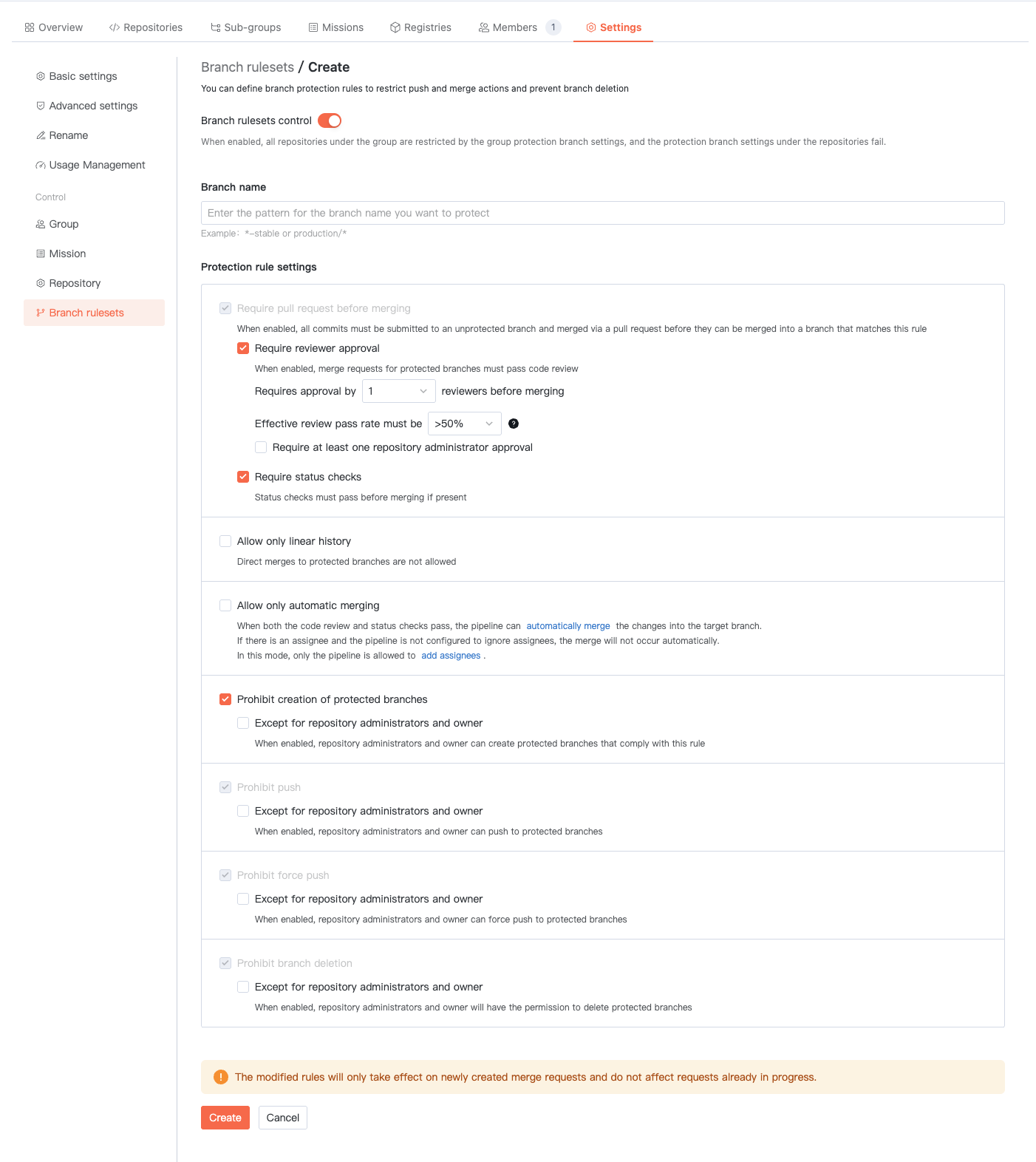 2. Fill in the branch name and rule setting information, then click Create to complete rule creation.