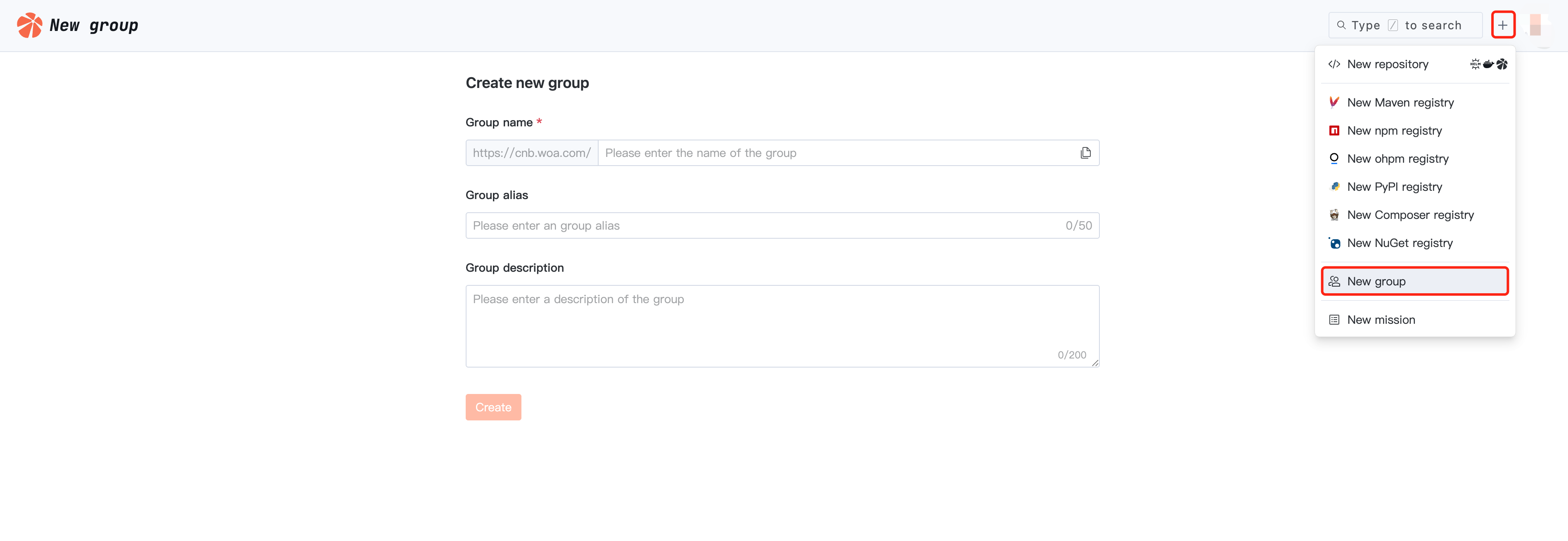 Enter CNB, click + in the upper right corner, select New group, fill in the organization name and related description, then click Create to complete the organization creation.
