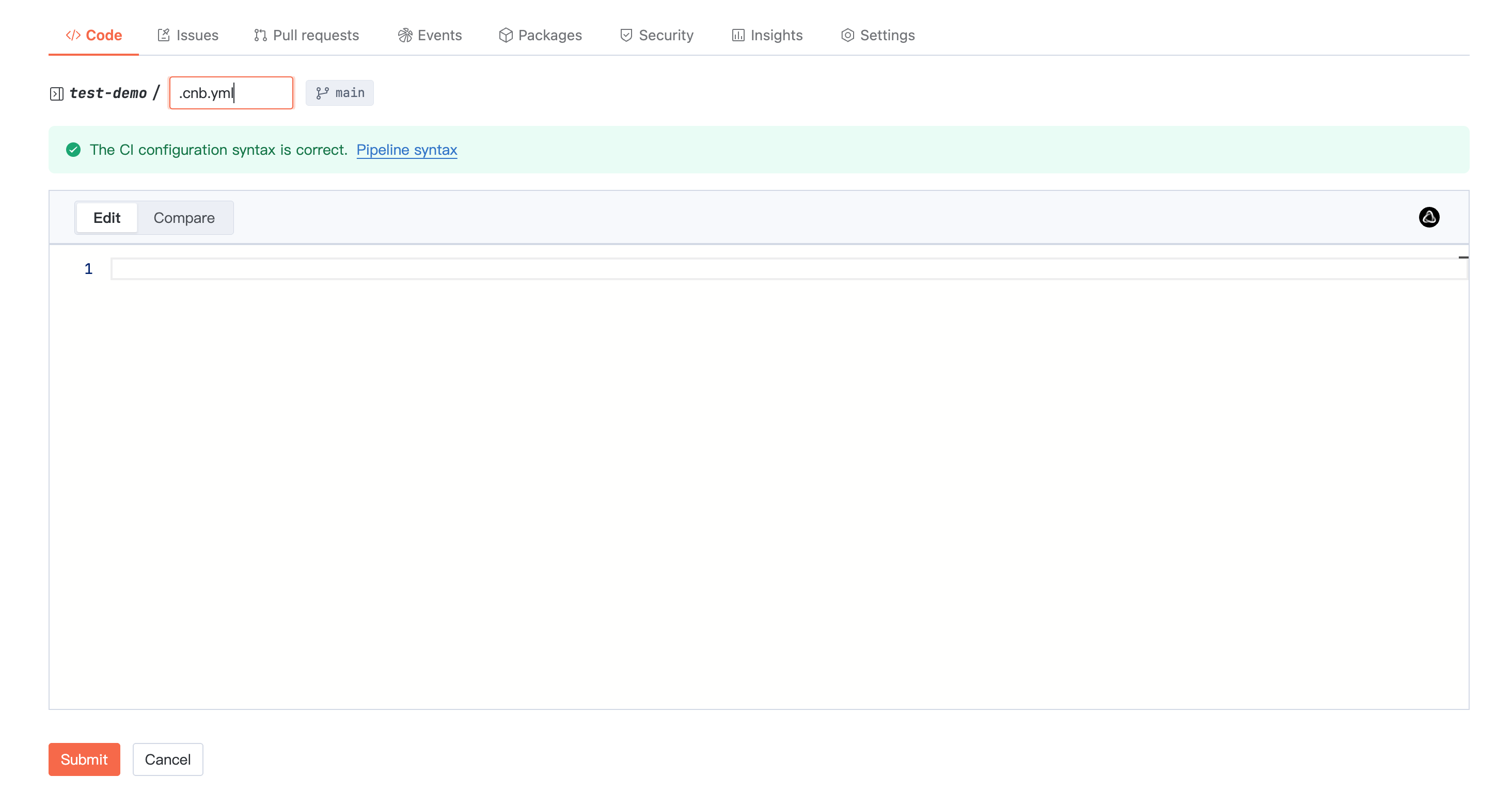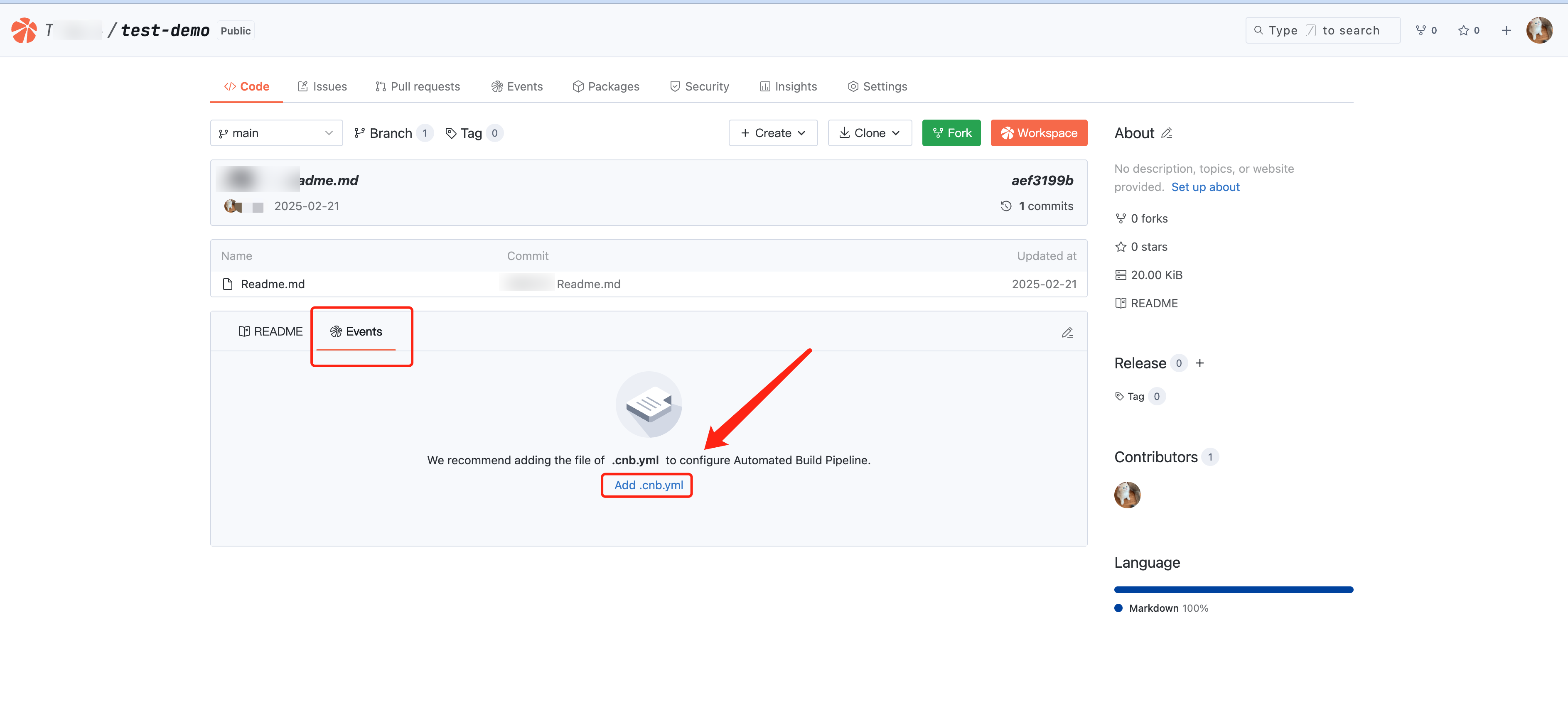 1. After entering the target repository, select Code > Events, click Add .cnb.yml to enter the file configuration page.