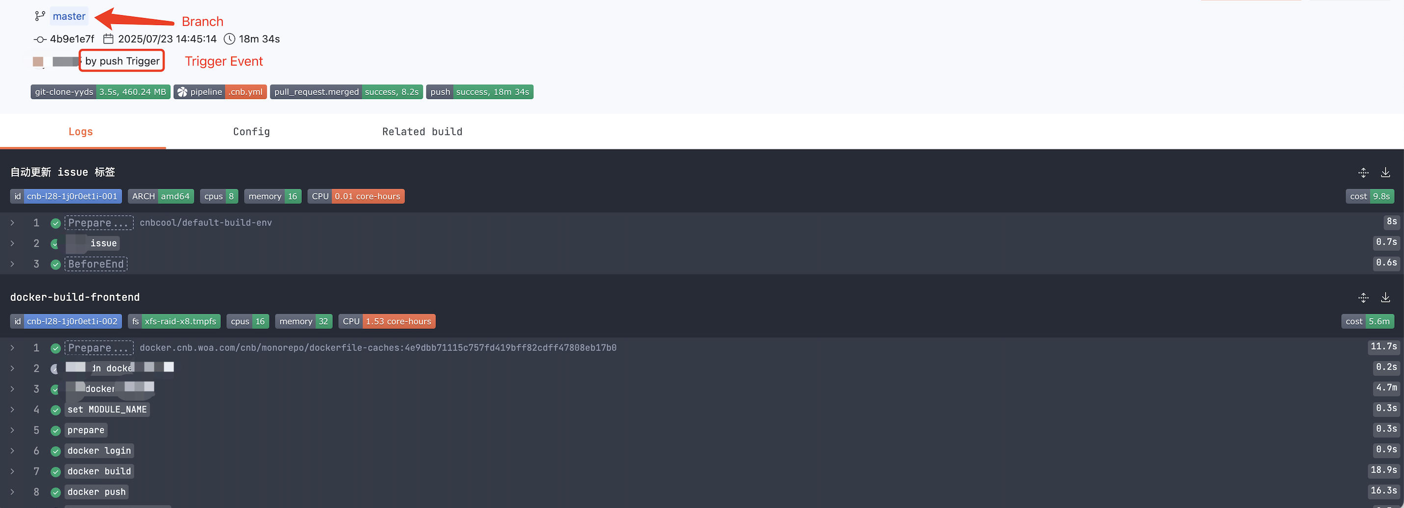On the warehouse page, click Cloud Native Build to view the build list. The latest one is the push event flow triggered just now. The record with a loading flag below corresponds to the native development build.