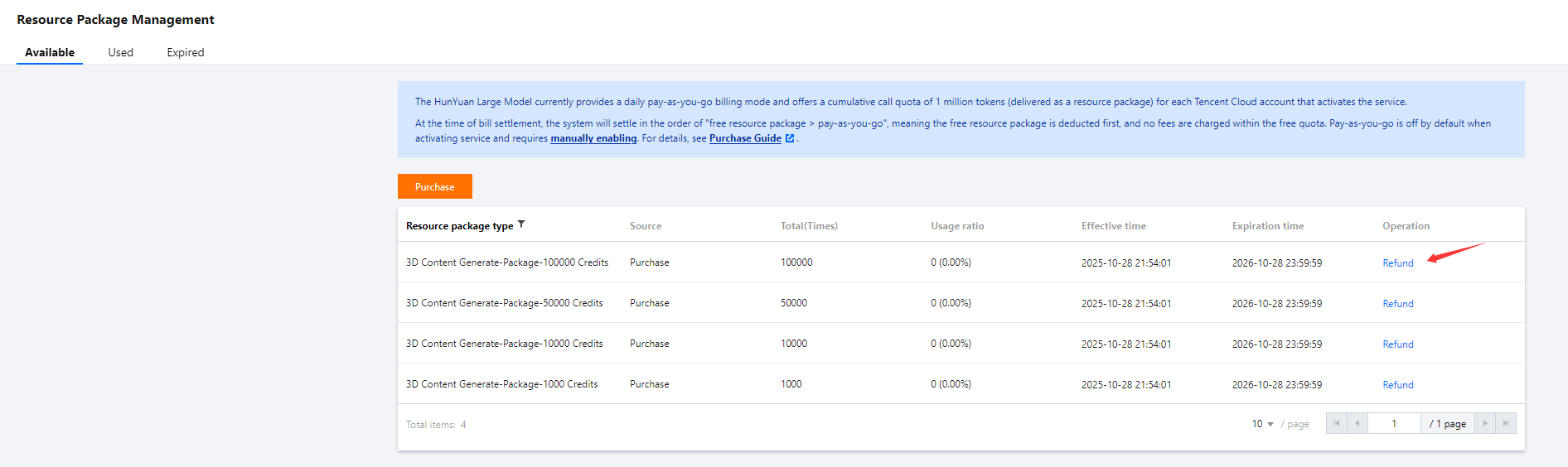 If you purchased the Tencent HY 3D Global resource package on May 1, 2024, and the resource package remains unused, you can enjoy a 7-days no-questions-asked refund by 23:59 on May 8, 2024. Starting from 00:00 on May 9, 2024, the resource package will no longer be eligible for return or refund.