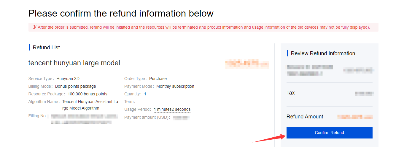 1. Log in to the Tencent HY console, go to the Resource Package Management page, select the resource package to refund, and click Refund. 2. Click Confirm Refund.