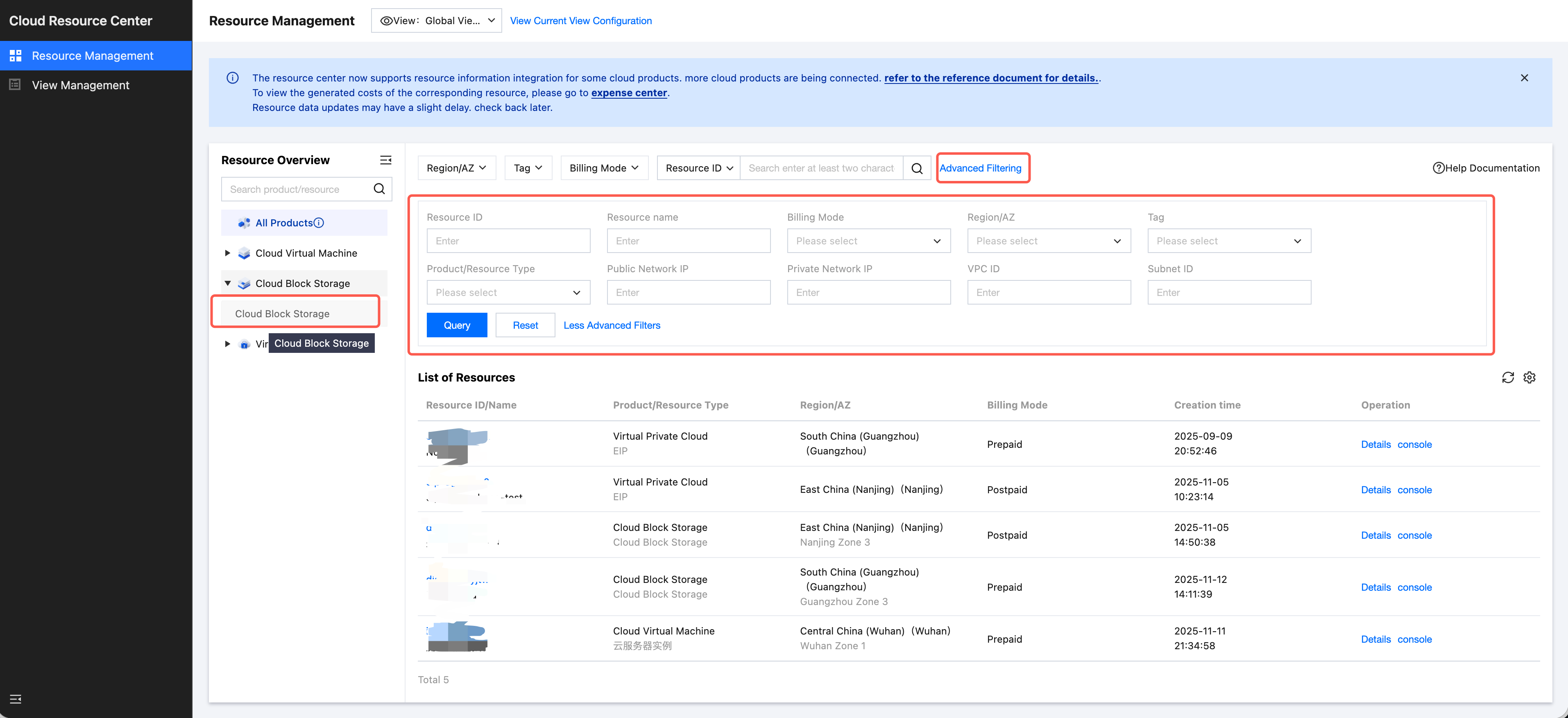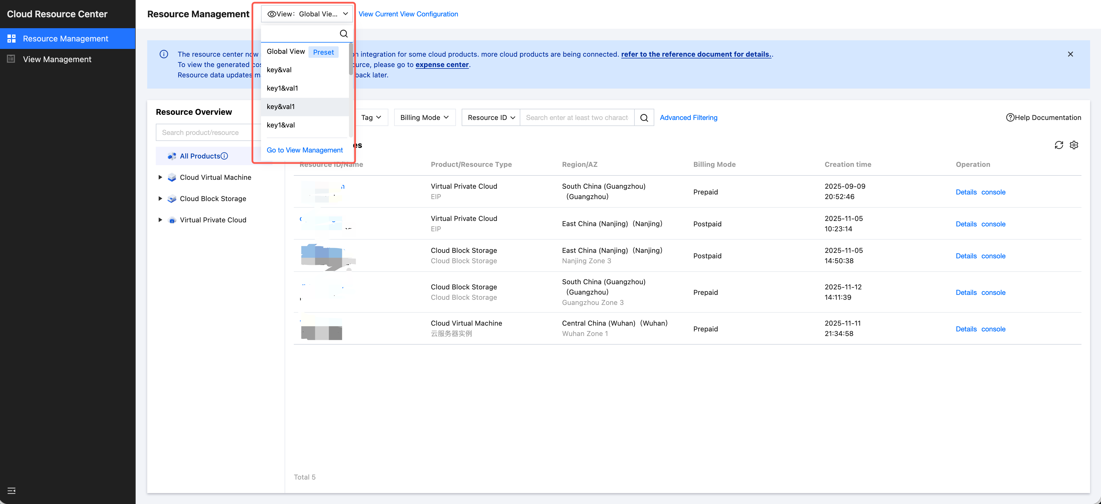 Before viewing and searching for resources, you need to first select a view as a data source (for details, see View Management). Meanwhile, the Cloud Resource Center also provides all users with a "Global View (Preset Template)" as the initial default view. The Global View shows all resources under the current root account. Filter Resources