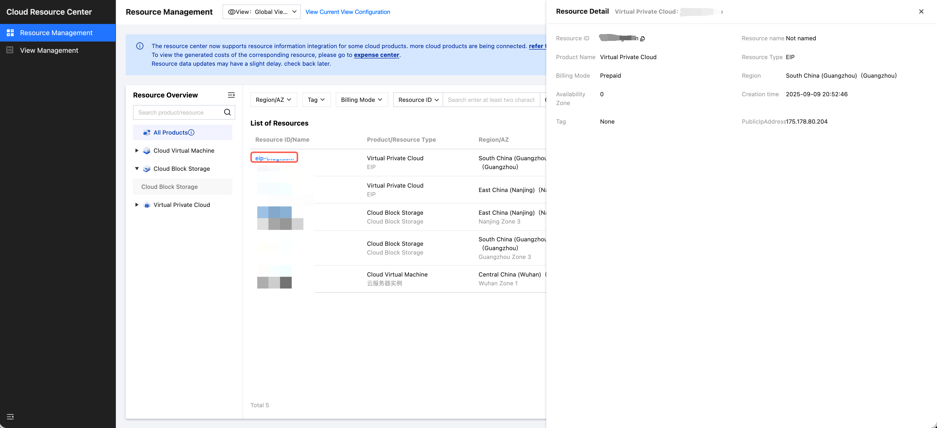 On the Cloud Resource Center webpage, click on the left Resource Management to enter the Resource Management page. Select View