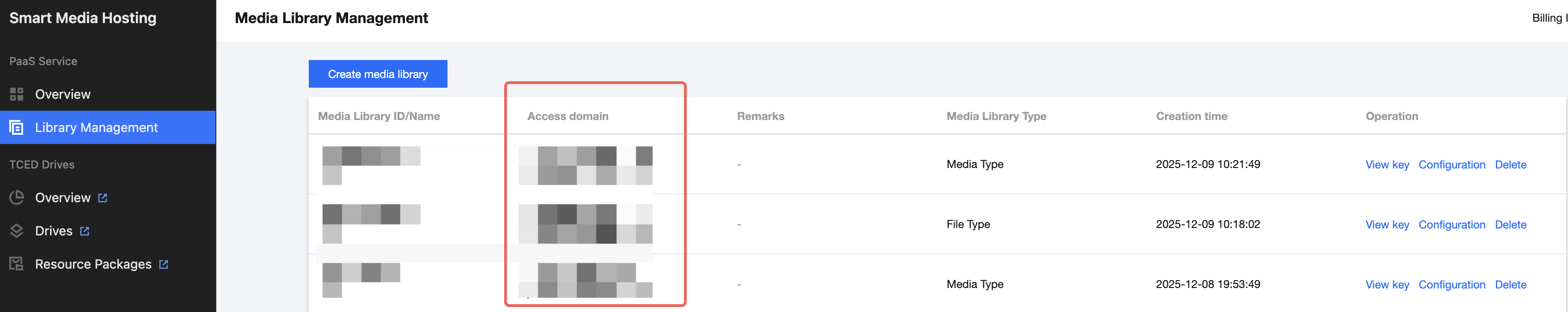Initialize SMHCollection, get instanceval smh: SMHCollection = SMHCollection(context = context,user = mySMHSimpleUser,// Assign the "Access domain" displayed after creating a media library through the console to customHostcustomHost = "<libraryId>.api.tencentsmh.cn")