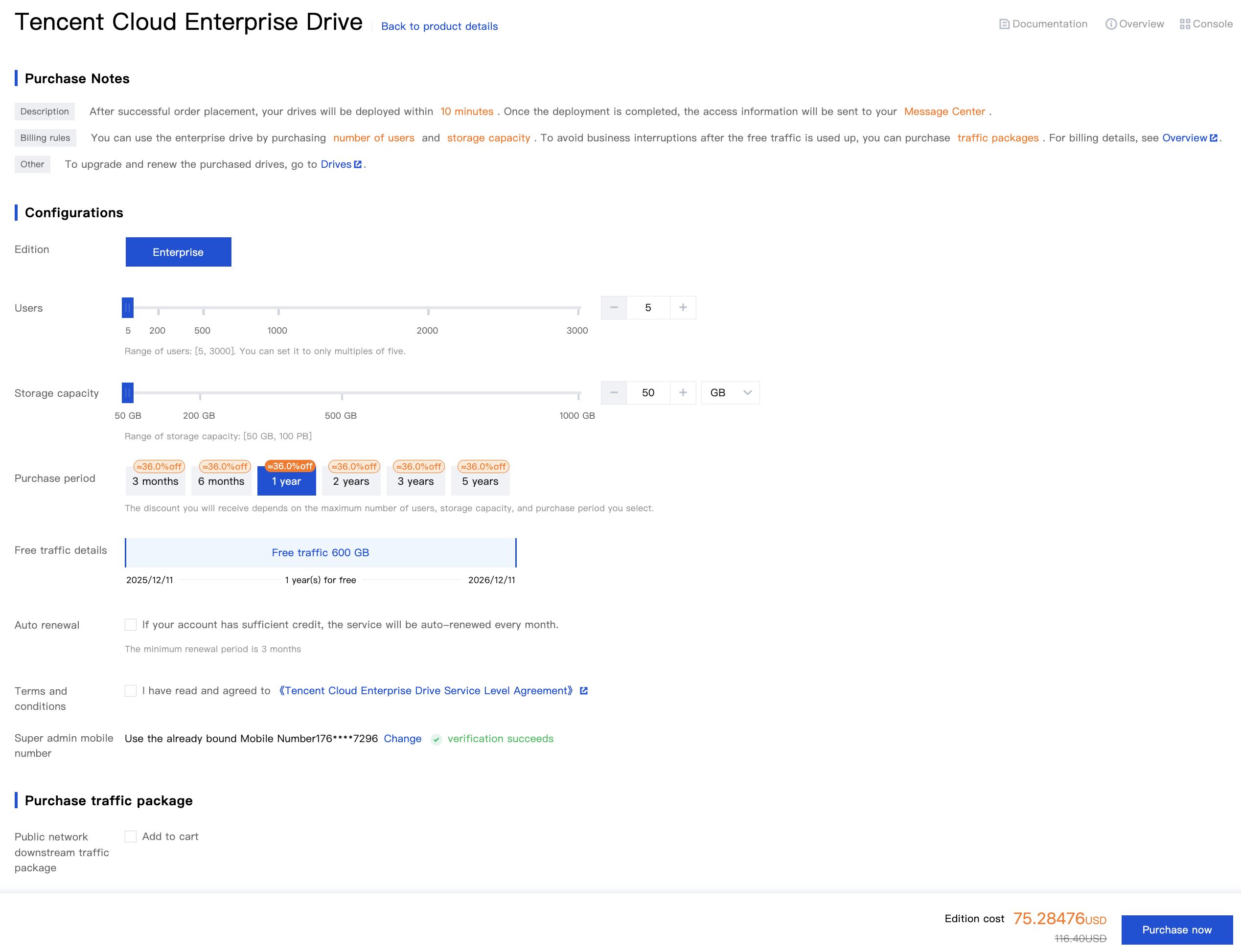 Number of users | Yes | The number of users refers to the number of users utilizing the enterprise cloud drive. The minimum selectable number of users is 5, and the maximum is 3000. If you require more users than the selectable quantity, please submit a ticket to contact us. |