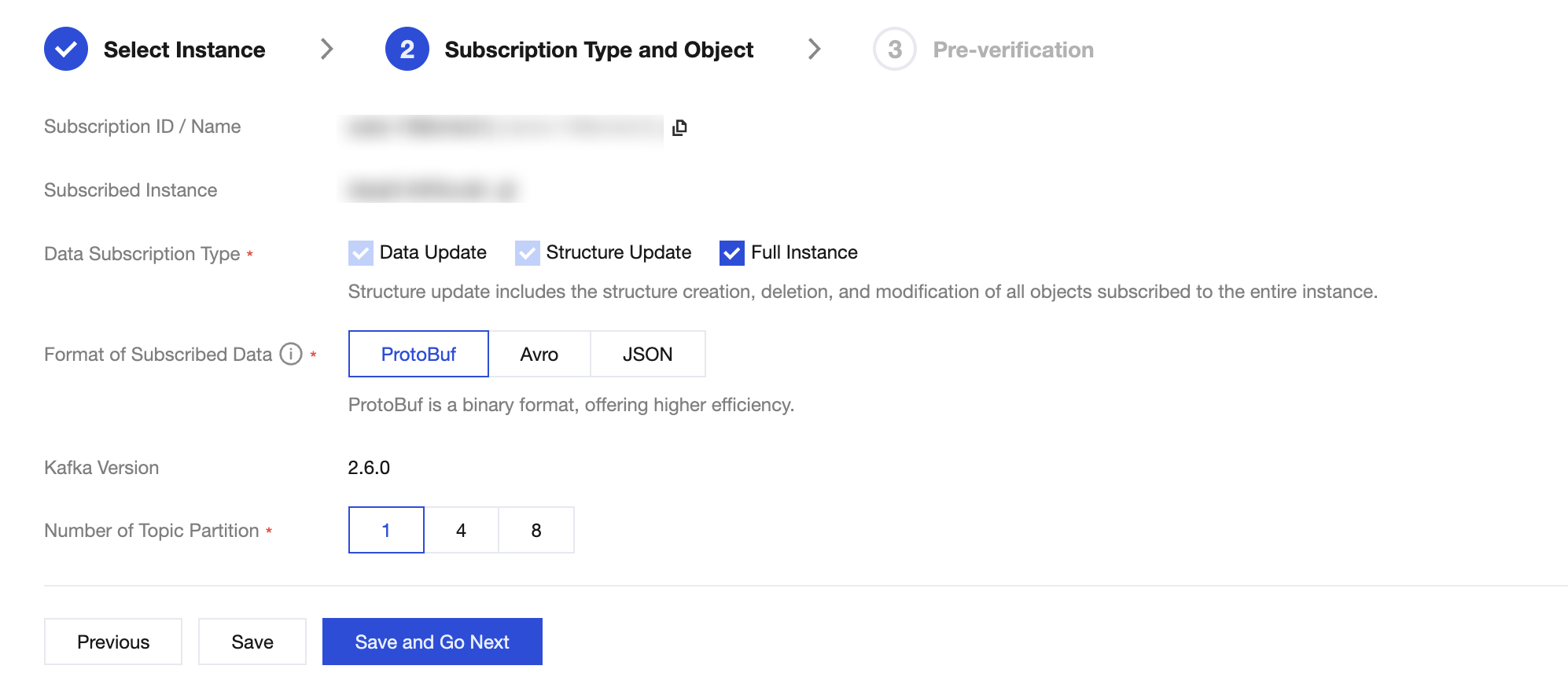 Format of Subscribed Data | Supports ProtoBuf, Avro, and JSON. ProtoBuf and Avro are binary formats offering higher consumption efficiency. JSON is a lightweight text format that is simpler to use. |